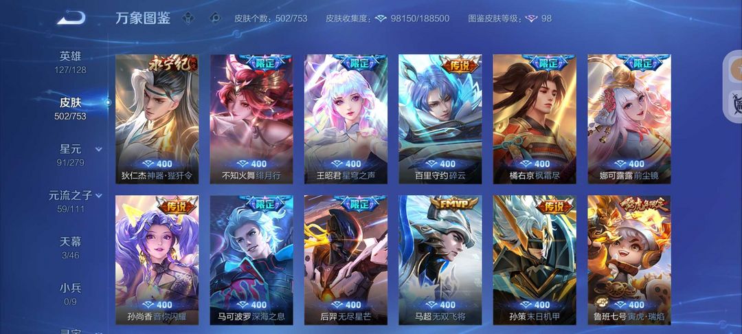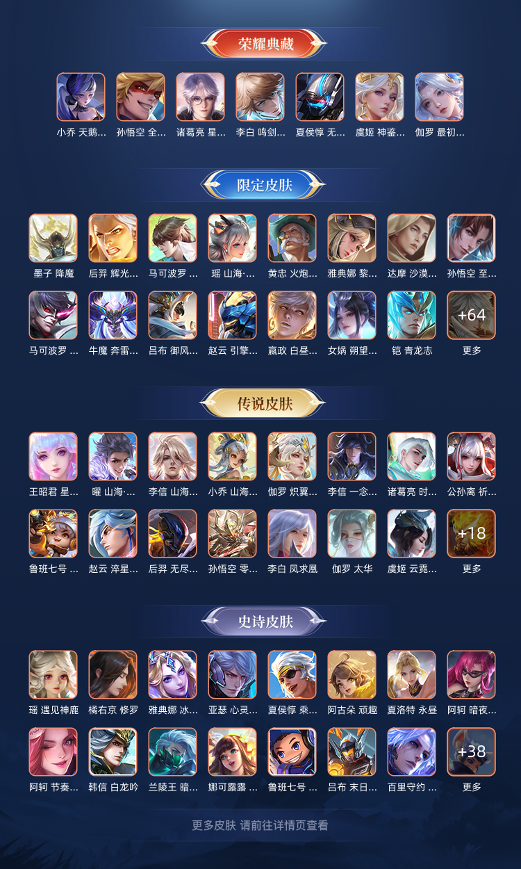 装备描述:502皮肤女号❤金标瑶妹少司缘❤游走47段❤貂蝉慕夏❤8典藏7珍品大耳狗库洛米❤蛇年限定皮