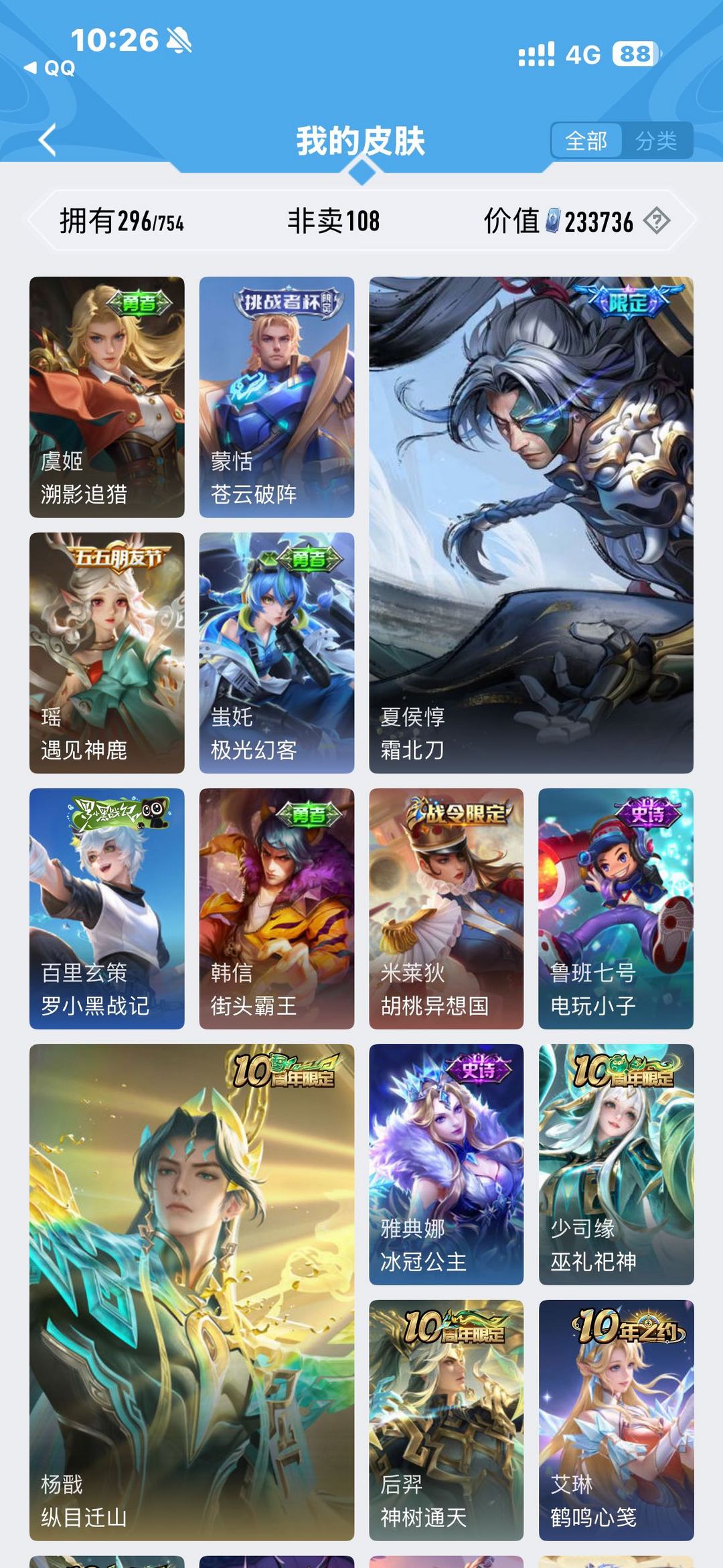 装备描述:貂蝉幻阙歌,曜、李信、夏洛特全皮,夏侯惇霜北刀,鼠年限定全皮。还有诸多限定皮肤