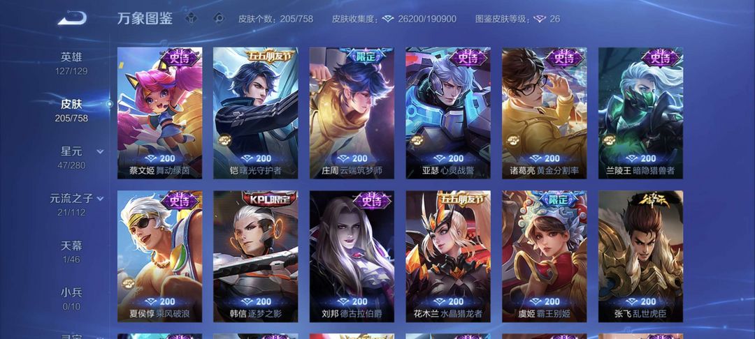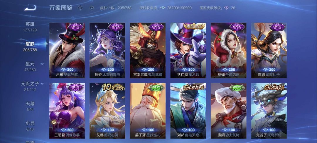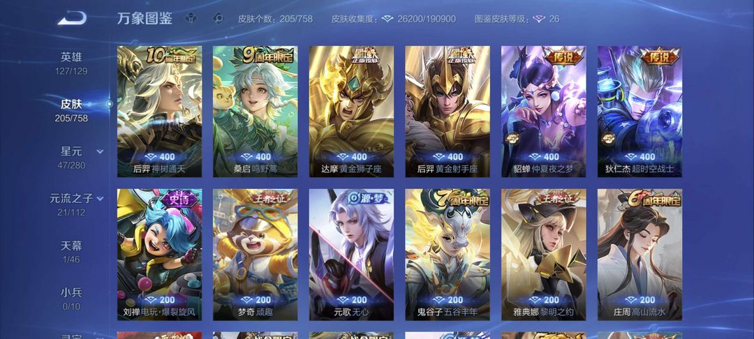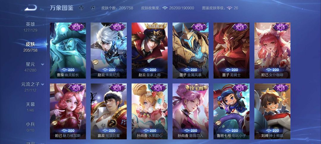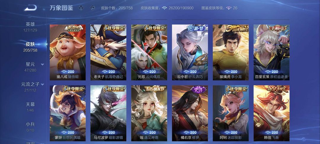 限制: 租号10次及以上 |装备描述:205个皮肤,皮肤不多,可排位,回归账号,无武则天和敖隐