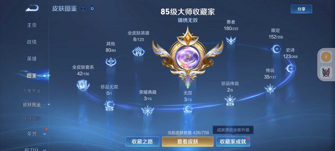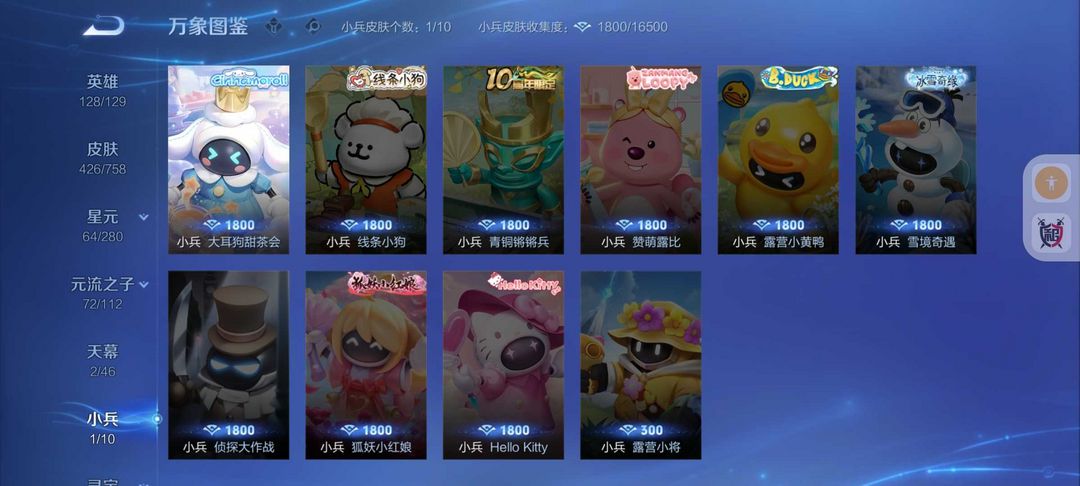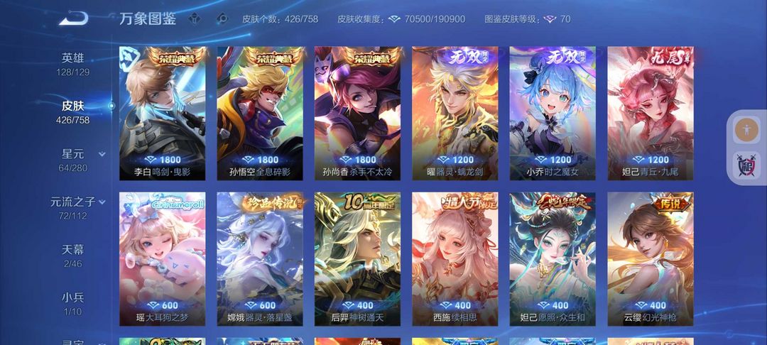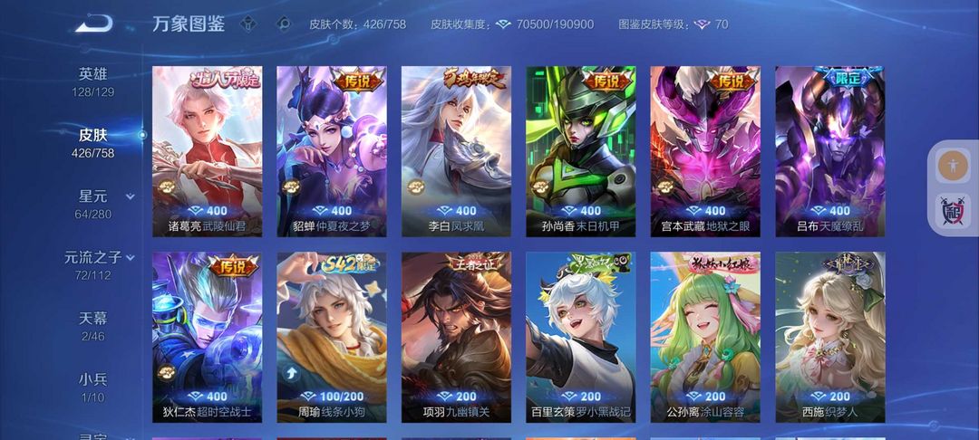 装备描述:425皮肤❤4典藏3无双皮❤大耳狗小兵❤鸣剑全息❤曜无双大耳狗35传说皮蛇年限定❤