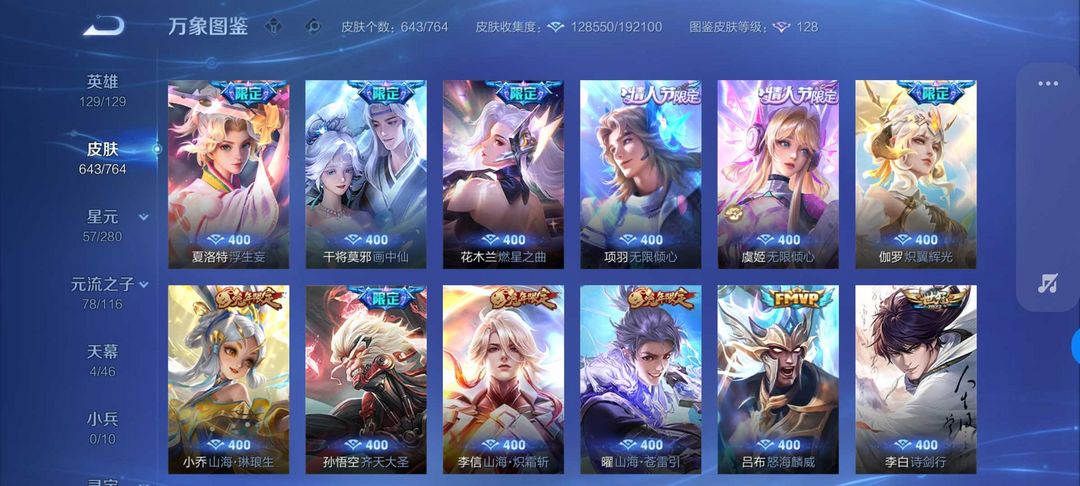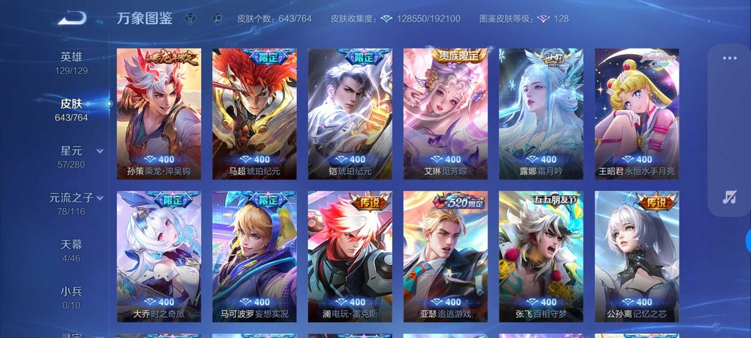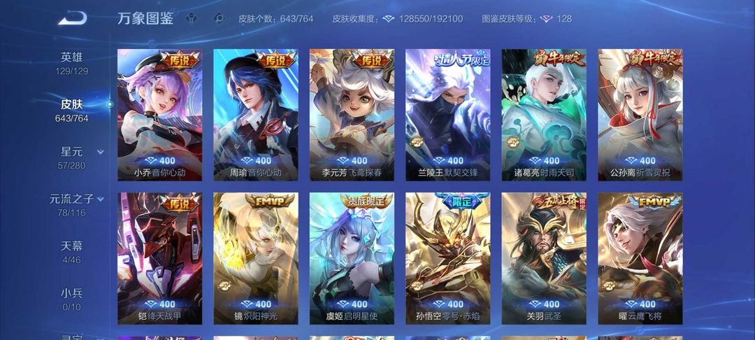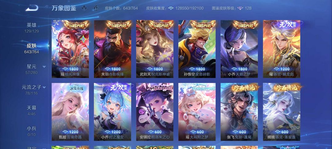 装备描述:643皮肤❤️女号❤️6典藏3无双105传说皮❤️昭君FMVP螭龙剑大耳狗库洛米满蛇年❤️紫瑶❤️瑶典藏