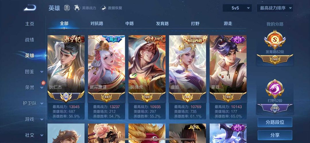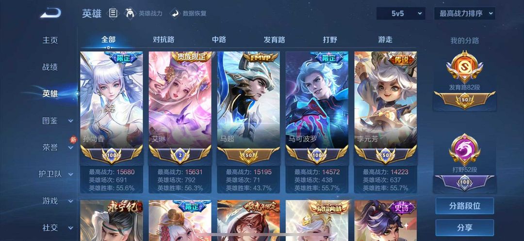✨82段发育路✨52段打野✨马克孙尚香艾琳李元芳狄仁杰小国✨五国服✨高质量贵族十