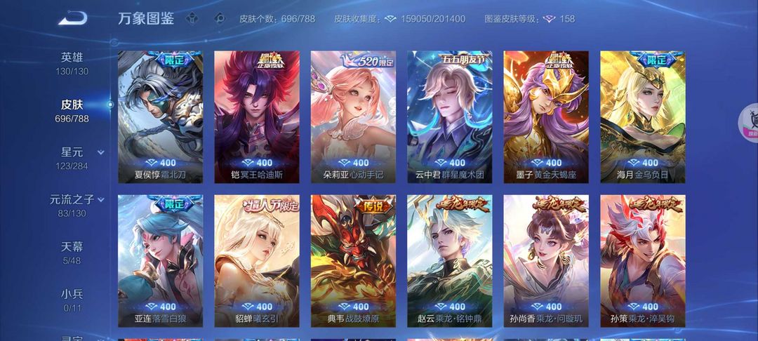 装备描述:696皮肤❤馥梦繁花8典藏满珍品12无双❤126传说满马年限定16星传说❤李信无双无相神罪❤超值全新皮❤