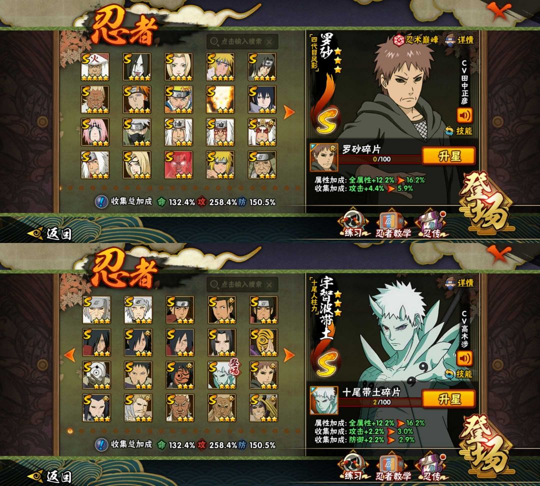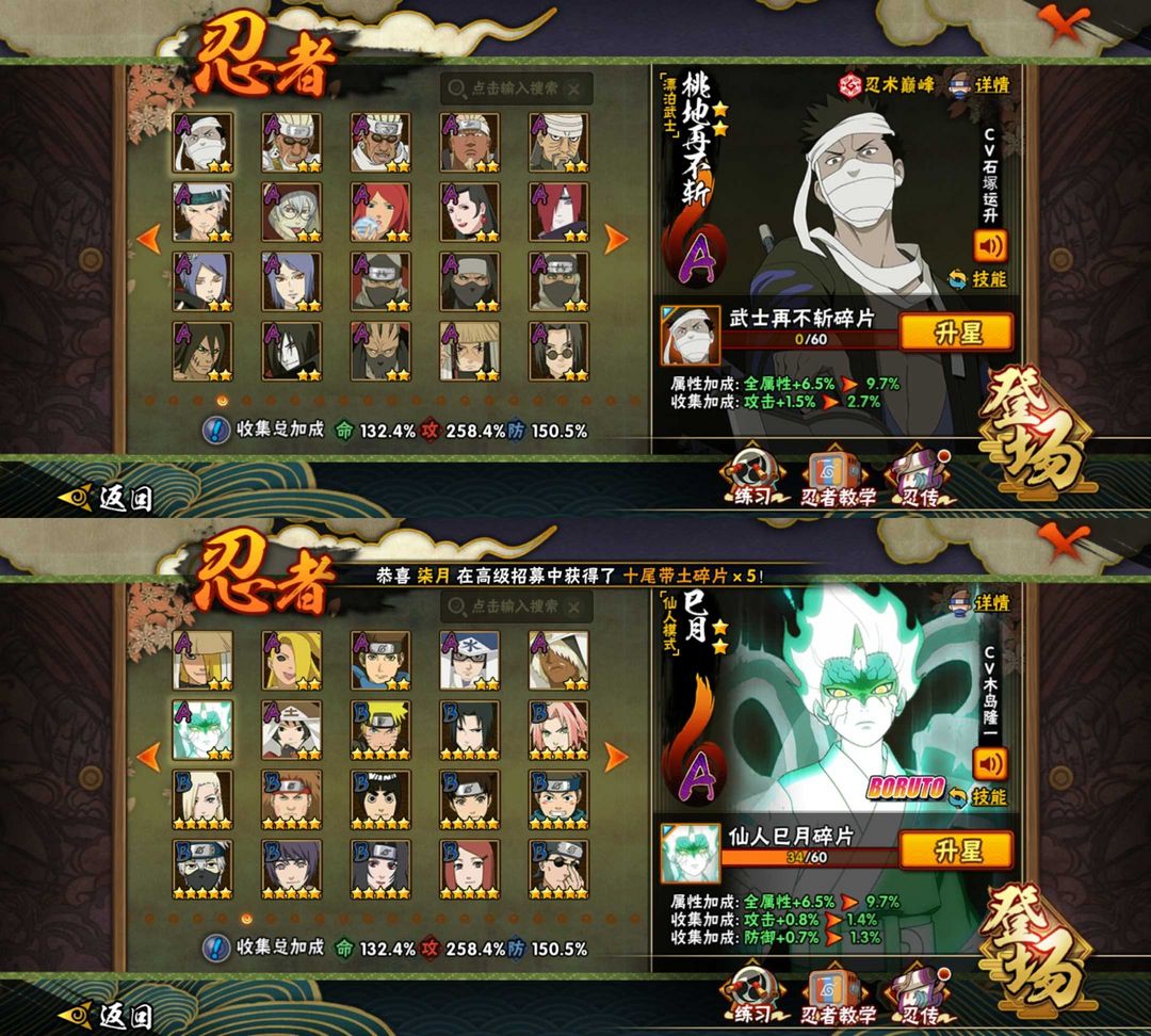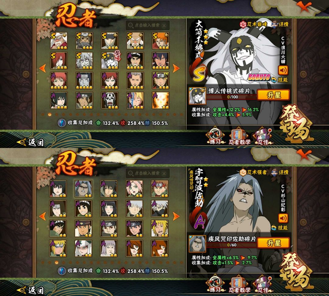 装备描述:九喇嘛鸣人 忍战带土 忍战大野木天道超 青年斑 漂泊佩恩 暴怒小孩宇智波斑 「秽土转生·解」45S★秽土解斑★永恒万花筒★红夜面具男★木叶创立★忍战带土★佩恩天道超【漩涡鸣人 「九喇嘛