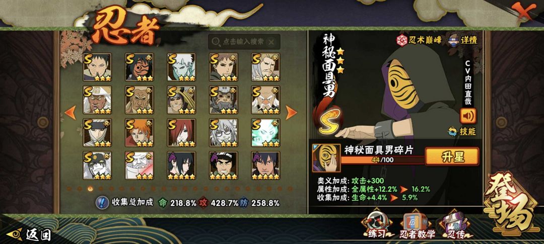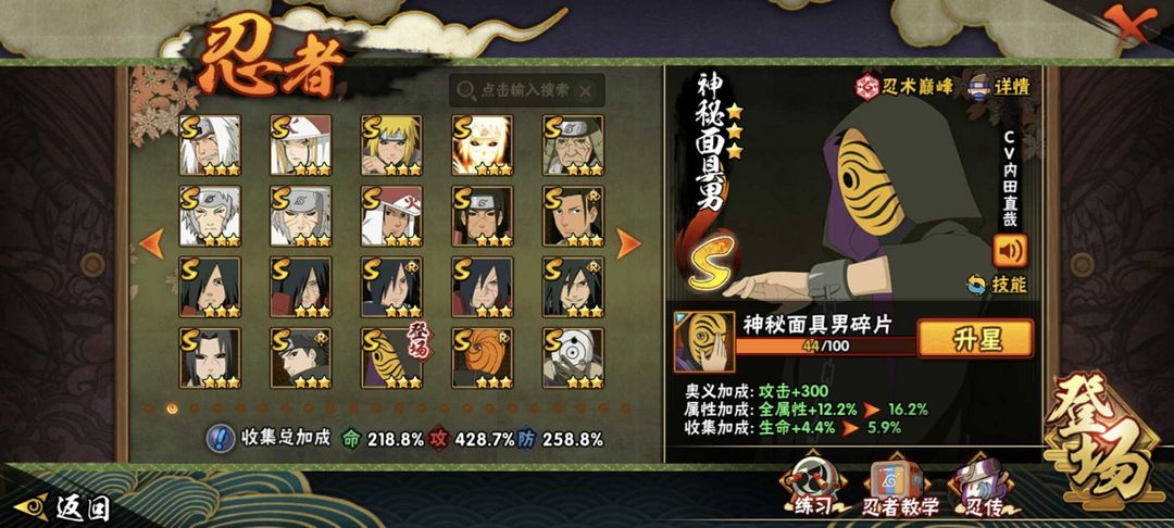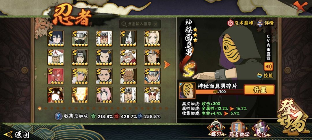 轮墓5分钟✨带帽虎皮✨无上忍道84魅力4700w✨全忍者全通灵✨五星紫狗须佐卡卡✨五星须佐鼬天道