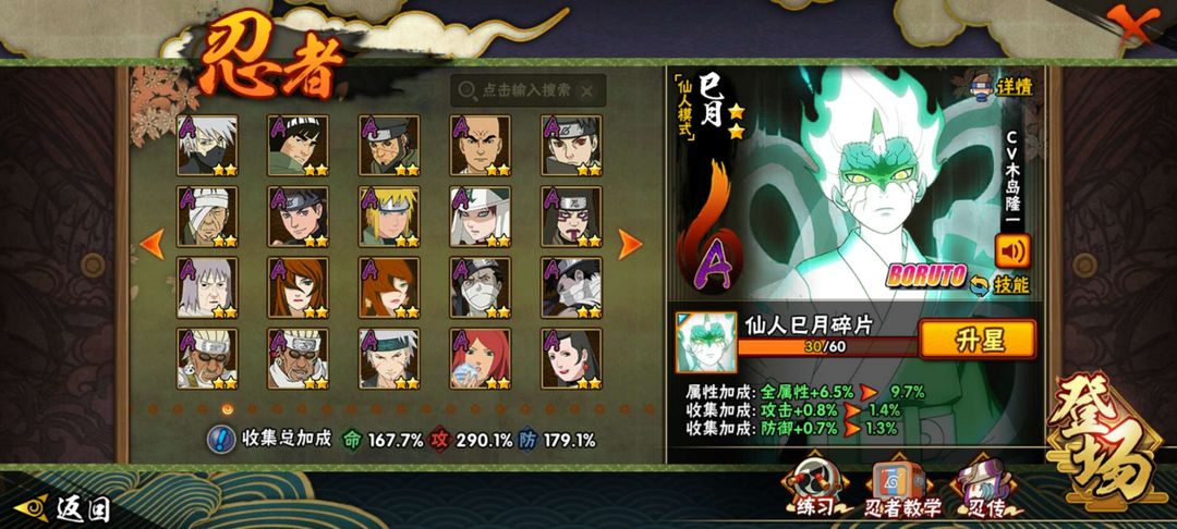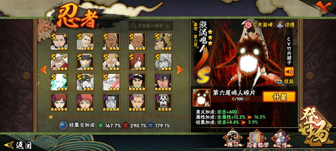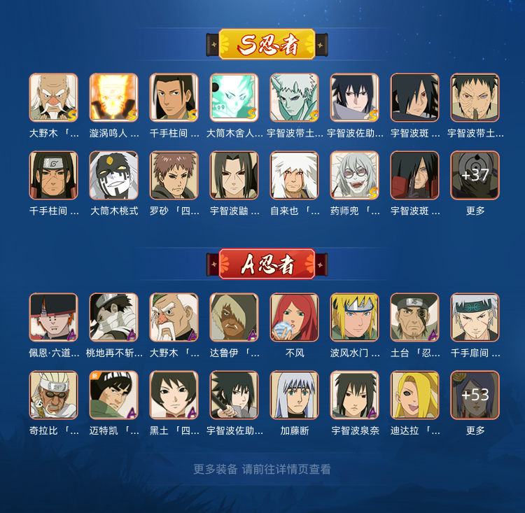 装备描述:50s400忍者♒全忍法贴s至高♒漂泊佩恩再不斩♊全忍者♋全忍法贴♍鬼鲛皮肤♐忍战带土全高招♑3000w至高♒全套请游戏局内保持文明,防止禁言影响他人游戏,祝您玩得愉快!