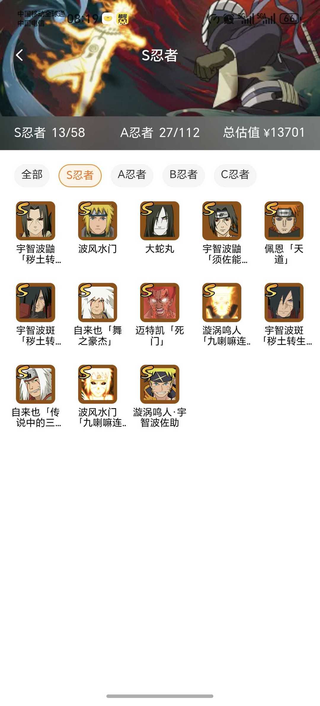 限制: 租号5次及以上 |装备描述:13S26A✨传说自来也,秽土解斑✨九喇嘛鸣人✨秽土鼬✨死门凯✨川自