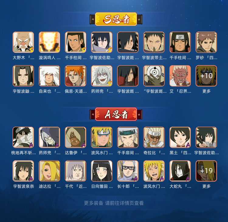 装备描述:23S 29A 189忍者 波风水门「新春限定」/神秘面具男 「红夜之刃」/宇智波斑 「秽土转生·解」/千手柱间 「木叶创立」/漩涡鸣人 「九喇嘛连结」/宇智波斑「白面具」/宇智波带土「忍界大战」/宇智波佐助 「永恒万花筒」/佩恩·天道「超」
