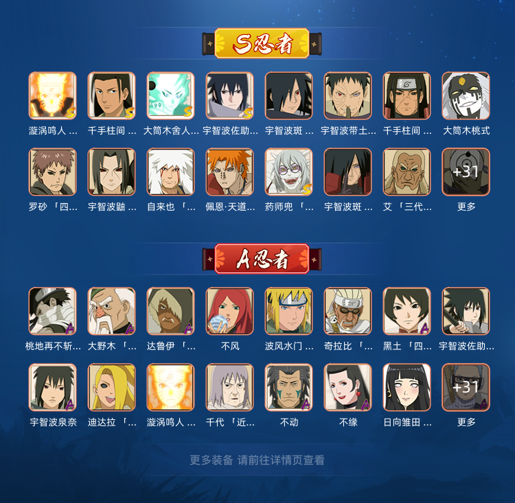 装备描述:火影忍者46s,46a,通灵熊猫,最新高招S自来也,最新忍法贴,忍战带土,白面具,黄面具,红面具,天道超,活死二代,活死柱间,黄猿,