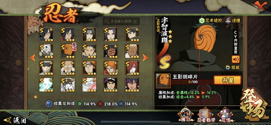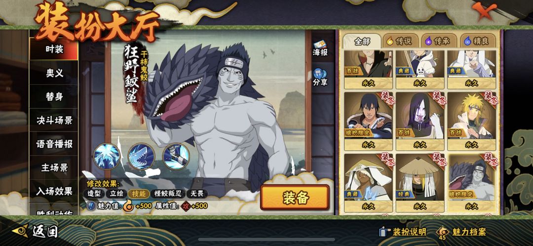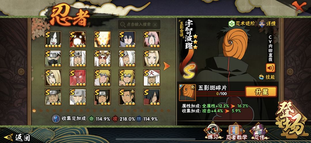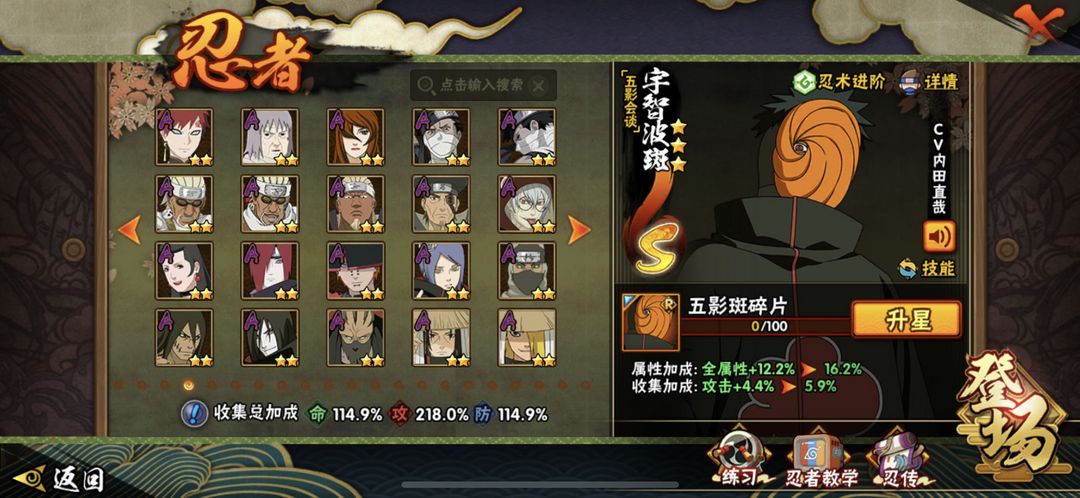 装备描述:40S五影会谈[斑] 六尾鸣人 秽土再不斩 传说自来也 舍人 天道超 盾狗 桃式 须佐止水