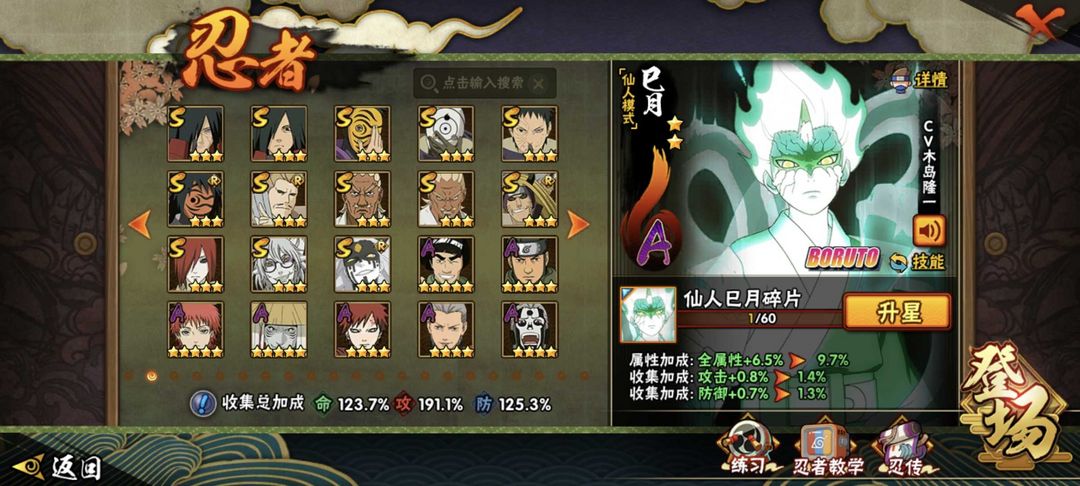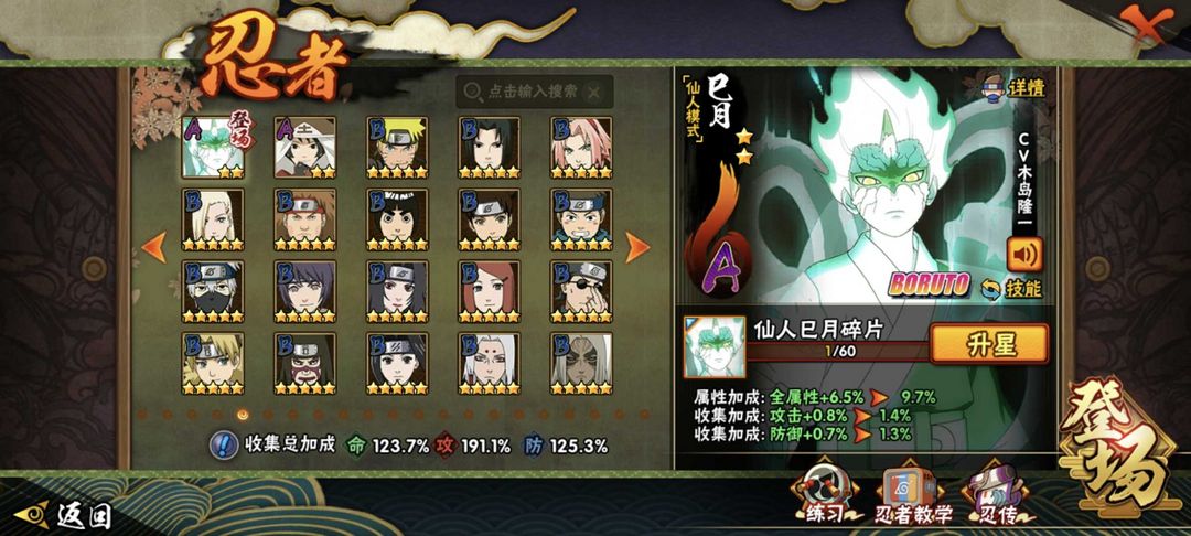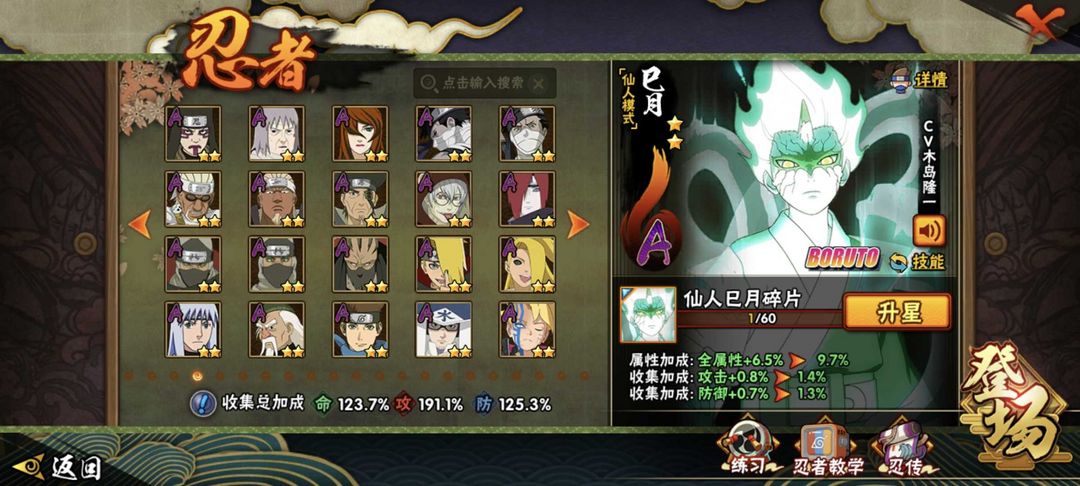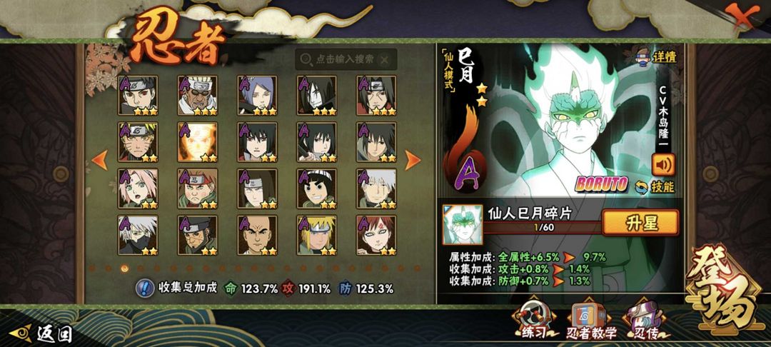 装备描述:45S超多点卷A忍✨仙人已月已秒✨九喇嘛水门以秒✨传说自来也✨忍战卡卡西✨漂泊全套✨全忍者✨火影忍者