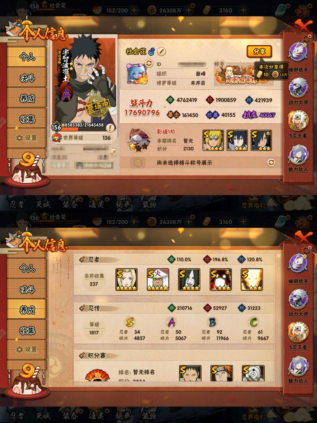 〖34S 50A 1367万 237忍〗漂泊带土❤暴怒六尾鸣人|传说自来也♑大筒木舍人♑须佐卡卡西