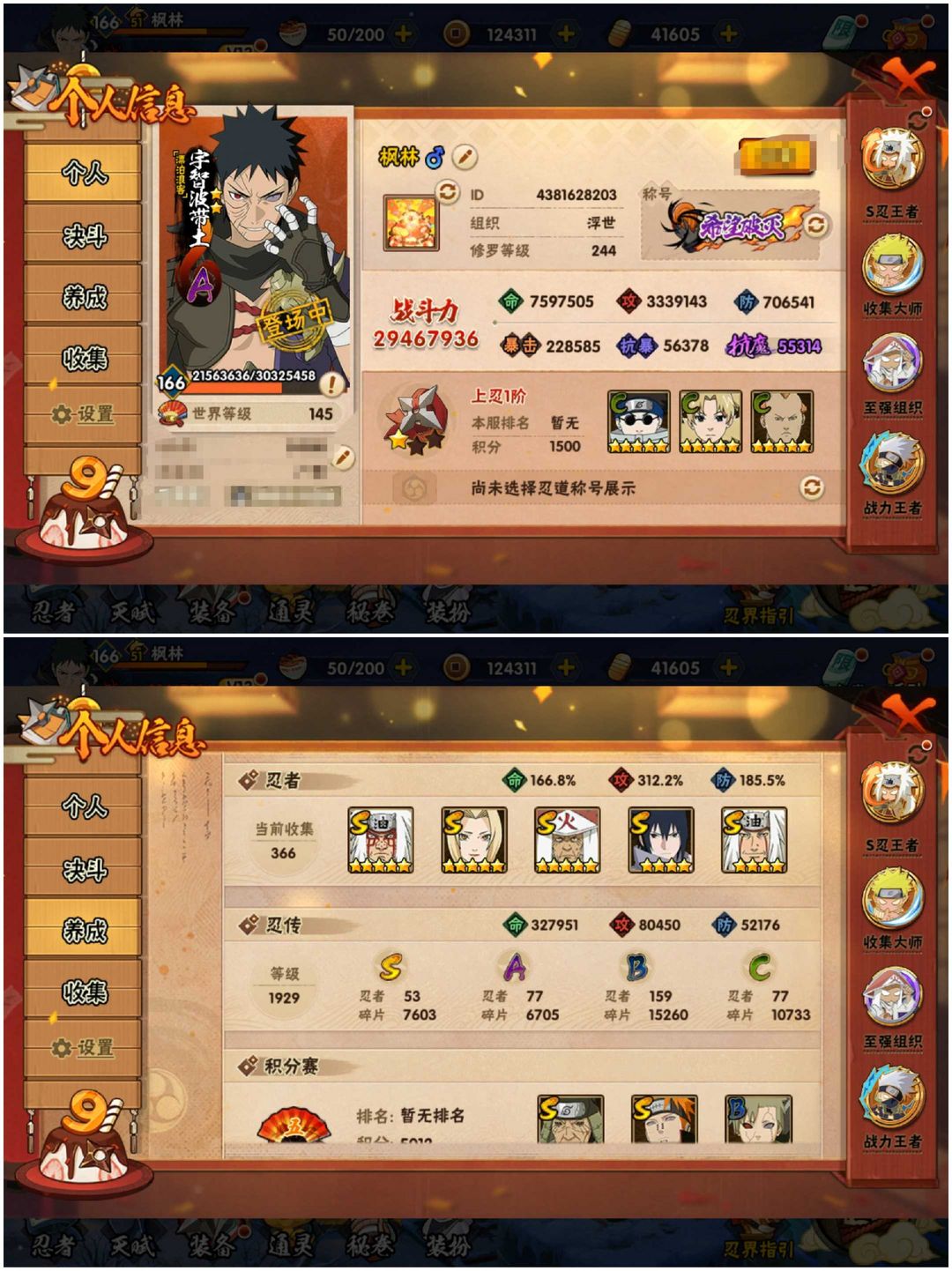 限制: 撤单率<40%才可租用此帐号装备描述:S忍者:【大野木 「忍界大战」,漩涡鸣人 「九喇嘛连结」,千手柱间 「木叶创立」,大筒木舍人 「最终章」,宇智波佐助 「永恒万花筒」,宇智波斑 「木叶创立」,宇智波带土 「忍界大战」,千手柱间 「秽土转生」,大筒木桃式,罗砂 「四代目风影」,宇智波鼬 「秽土转生」,自来也 「舞之豪杰」,佩恩·天道 「超」,药师兜 「仙人模式」,宇智波斑 「秽土转生」,艾 「三代目雷影」,“宇智波斑” 「白面具」,半藏 「秽土转生」,千手扉间 「秽土转生」,纲手 「百豪」,无 「二代目土影」,宇智波斑 「五影会谈」,漩涡鸣人 「暴怒·第六尾」,烈斗 「初代目风影」,宇智波止水 「须佐能乎」,艾 「忍界大战」,自来也 「传说中的三忍」,艾 「四代目雷影」,波风水门,波风水门 「秽土转生」,大蛇丸,大野木 「三代目土影」,纲手,鬼灯幻月 「二代目水影」,佩恩 「天道」,千手扉间,千手柱间,神秘面具男,自来也 「仙人模式」,宇智波斑,宇智波鼬 「须佐能乎」,猿飞日斩,猿飞日斩 「秽土转生」,长门 「秽土转生」,自来也,三代目风影 「秽土转生」,神秘面具男 「红夜之刃」,宇智波斑 「秽土转生·解」,春野樱 「忍