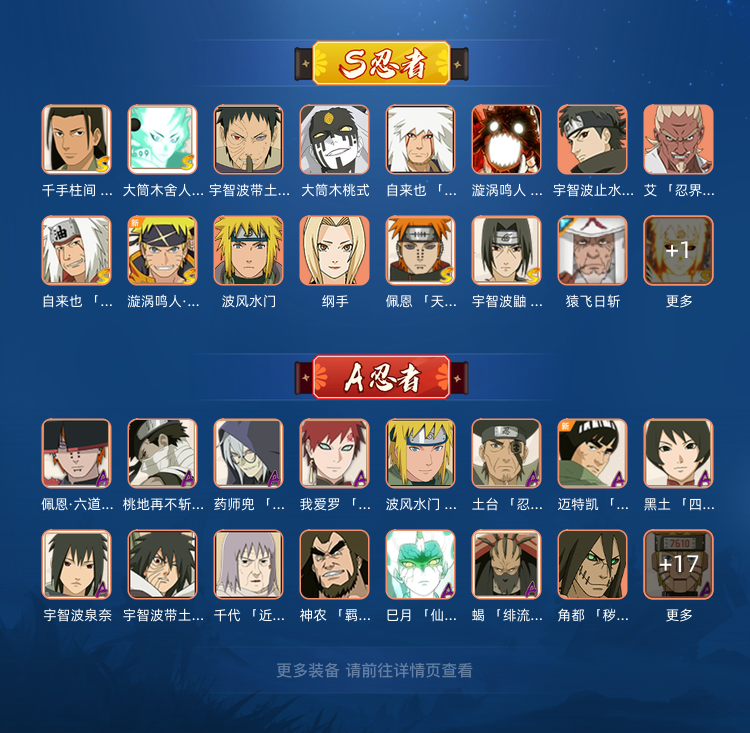 装备描述:漂泊带土,侠隐兜,鸡翅佐助,新春我爱罗 新春水门,六尾,五影班,漂泊佩恩