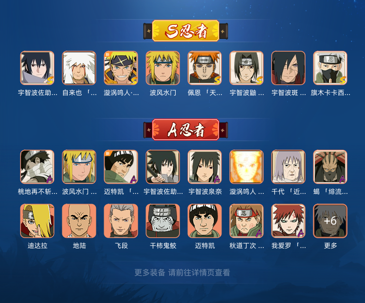 装备描述:8S⭐22A⭐百战鼬⭐死门凯⭐须佐卡卡西⭐须佐佐助⭐植物人⭐舍人