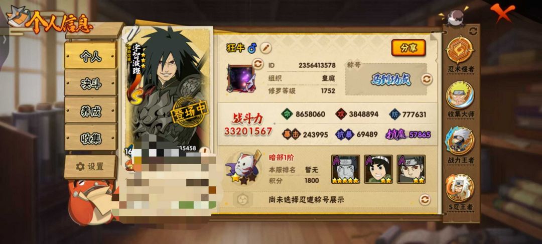 马斑 十尾带土❤氪金13万 3300万 54s84s❤超多点券A❤全高招T0❤忍战凯