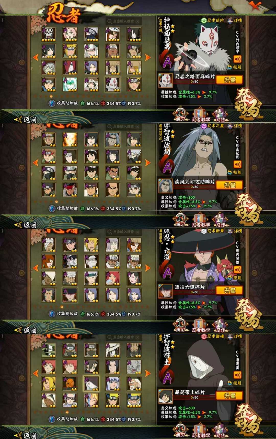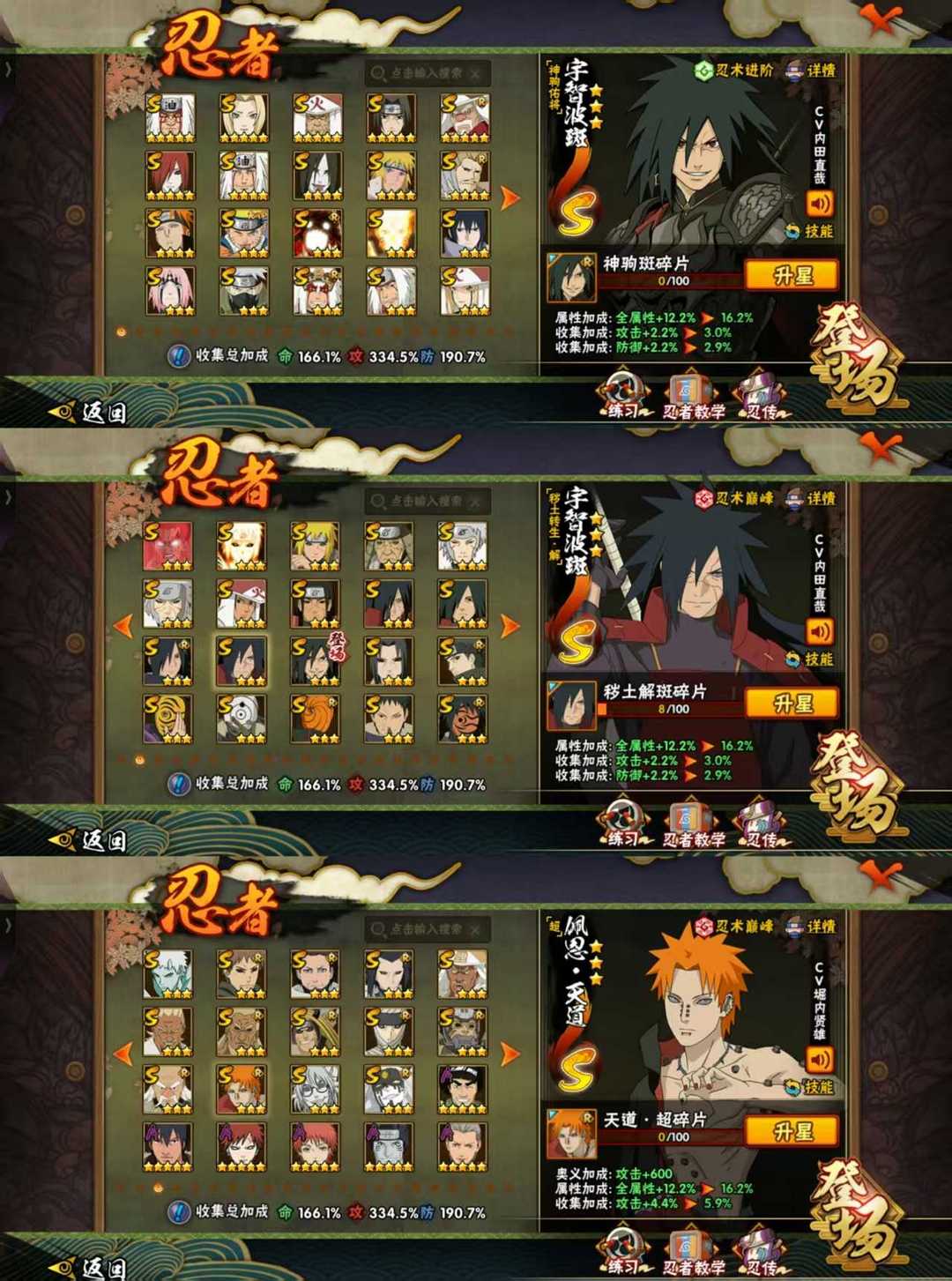 装备描述:-九喇嘛水门/须佐鼬/自来也已秒/绯流琥歇/须佐卡卡西/秽土解斑/佩恩百战/永恒佐助/忍战雷影/初代