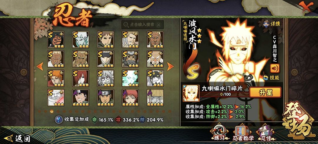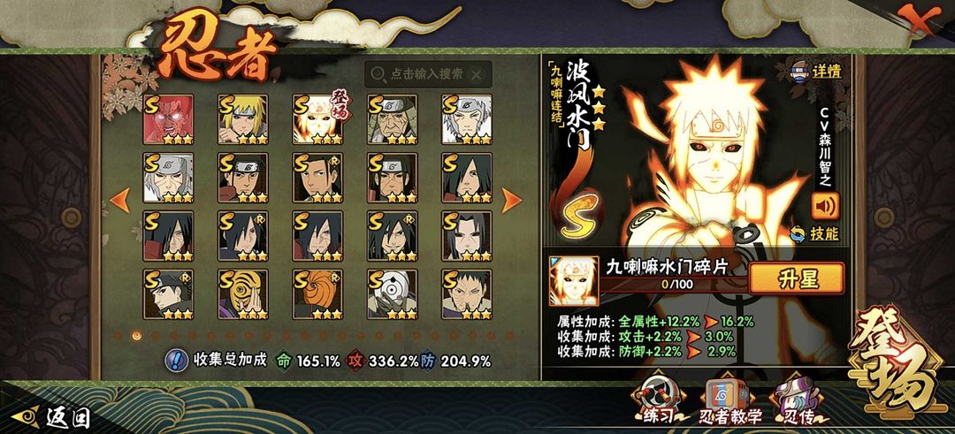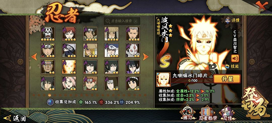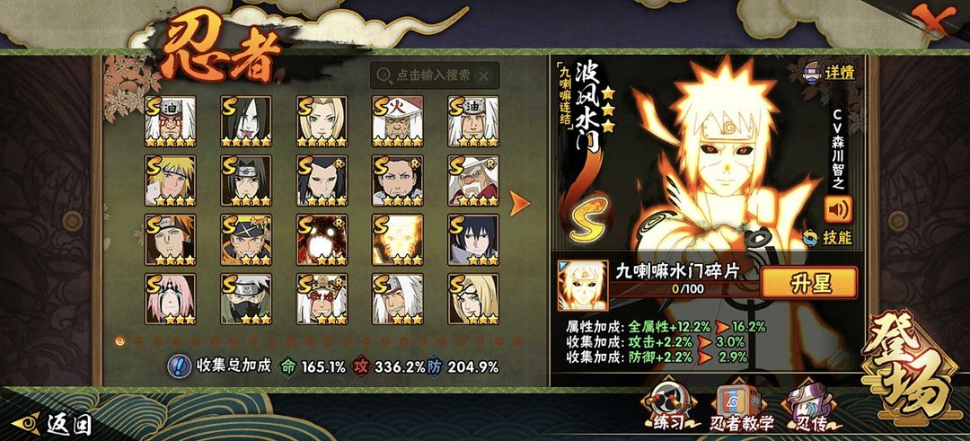 榜一顶配号,3400万战力全S忍者,A忍100以上,可玩性很高,各种团本都可以带