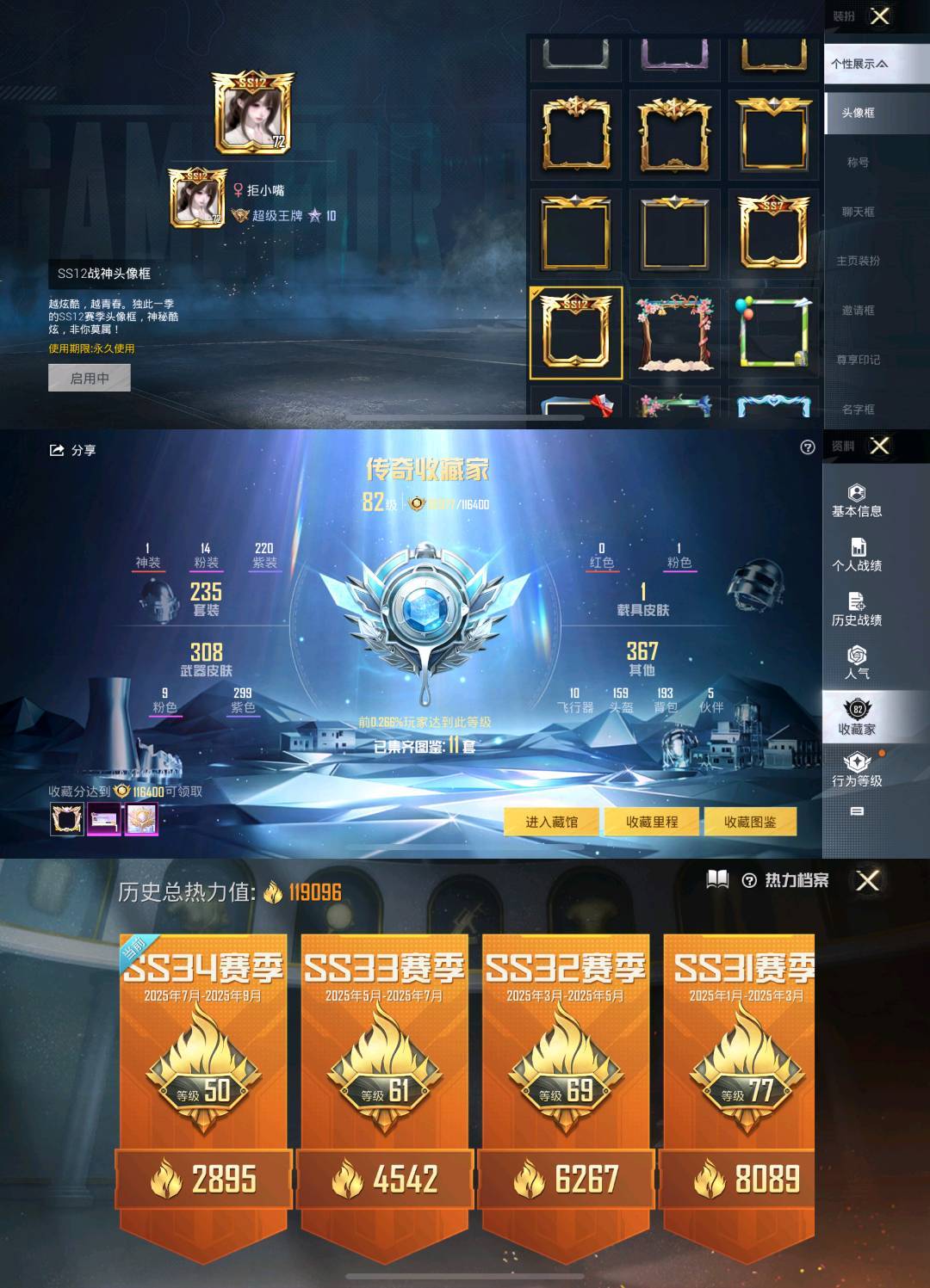 装备描述:12粉,1载具,124套装,7王牌印记,无敌战神历史最高段,M416-心之恋语/AUG-圣斗士星矢/GROZA-镜光银凌/M416-超新星/Mk14-盛世惊鸿/MG-36-沧焰双生/DP-28-豹影疾电/UMP45-量子极限/P90-冷漠罗丽/破片手榴弹-热量炸弹/Kar98K-巳巳如意/Kar98K-创世·救赎/Kar98K-未来歌姬/护世瑞兽/