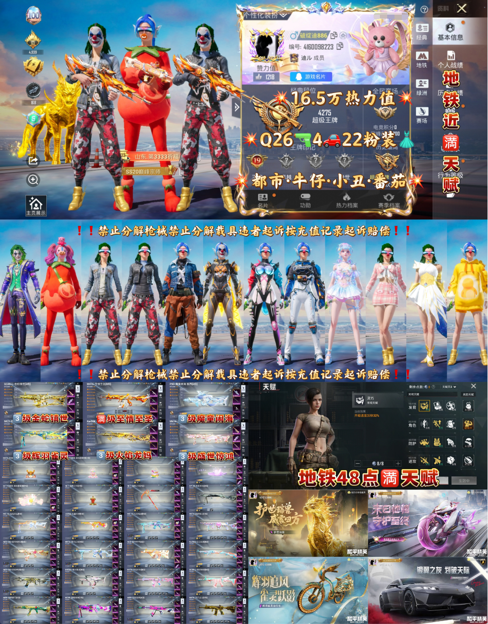 小丑✨金鞋✨赤蝎✨蓝口罩✨番茄✨DC小丑✨放客✨新101✨粉熊包✨满级至情✨地铁满天赋