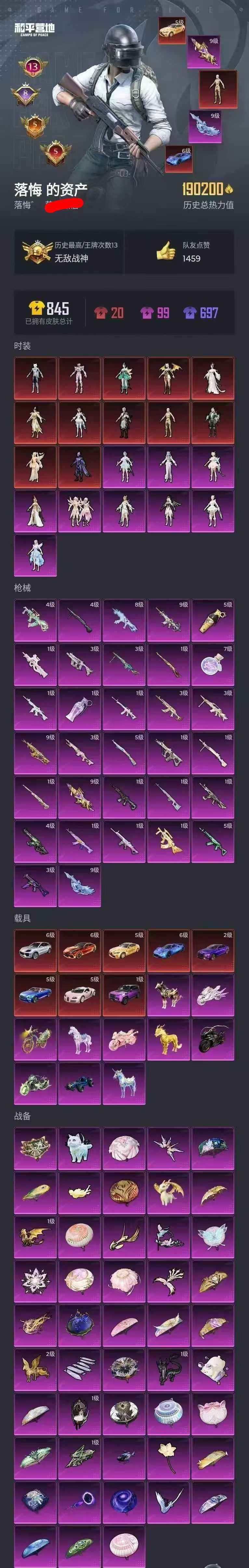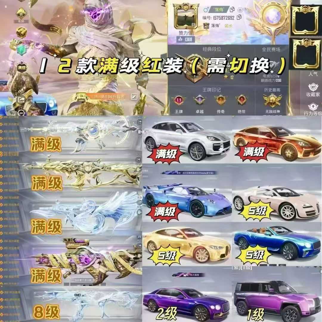 满级红装12件/满级车3辆/5级车3辆/满9级枪4把/满级星梦.灵猫.金蛇.沙丘/8级74u无垠阁
