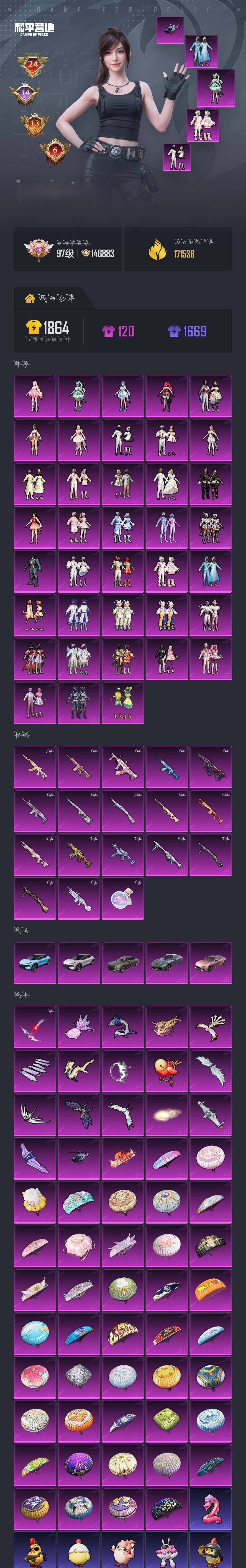 装备描述:速玩号⚡24印记⚡雪国都市小白龙梦幻火箭⚡10把满级枪⚡粉玛莎38粉18枪5车