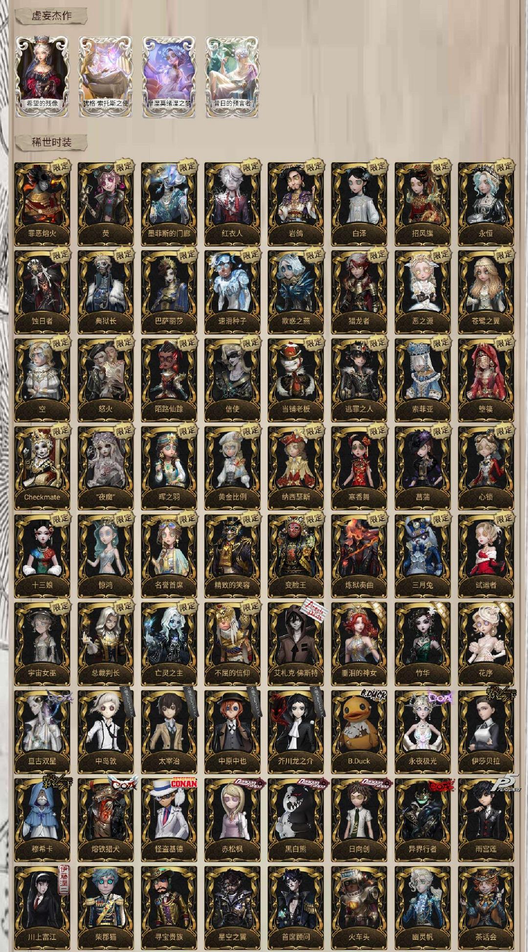 装备描述:❤️账号默认禁言,可以排位❤️ ❤️===虚妄===❤️ 犹格·索托斯之使、 摩涅莫绪涅之梦、 昔日的预言者、 希望的残像 ❤️===限定===❤️ 精致的笑容、 变脸王、 试运者、 司药、 宇宙女巫、 岩鸽、 红衣人、 寒香舞、 菖蒲、 心锁、 速滑种子、 十三娘、 惊鸿、 名誉首席、 总裁判长、 亡灵之主、 不屈的信仰、 信使、 陌路仙踪、 当铺老板、 三月兔、 炼狱奏曲、 索菲亚、 箜篌、 Checkmate、 “夜魔”、 黄金比例、 纳西瑟斯、 晖之羽、 逃罪之人、 溯光、 苍鹭之翼、 恒梦、 恶之源、 怒火、 空、 猎龙者、 欺惑之燕、 白泽、 招风旗、 永恒、 蚀日者、 典狱长、 巴萨丽莎、 荧、 罪恶熔火、 时空之影-墨菲斯的门廊、 不合时宜的危鲁弗、 未至之人 ❤️===金联动===❤️ 川上富江、 雨宫莲、 JOKER、 明智吾郎、 异界行者、 日向创、 黑白熊、 赤松枫、 怪盗基德、 江户川柯南、 工藤新一、 熔铁猎犬、 伊莎贝拉、 穆希卡、 永夜极光、 B.Duck、 中岛敦、 芥川龙之介、 中原中也、 太宰治、 亘古双星、 竹华、 花序、 垂泪的神女、 艾札克·佛斯特、 聂莫黎、 逐风蜗、 辛美尔、 芙莉莲 ❤️===普通金皮肤===❤️ 小丑皇、 拉塔托斯克、 流萤、 浴火绯花、 幽灵公主、 怪鸟、 初晴、 “剧场主持”、 闻雷爪、 寻宝贵族、 柴郡猫、 金纹大触、 盛宴伯爵、 忘川渡人、 夜来香、 尼德霍格、 天河、 小红帽、 不会枯萎的花、 女武神、 火车头、 花祭、 暗金蛋糕、 建筑师、 玛利亚公理、 花嫁、 白无垢、 死灵师、 寒霜、 摩根勒菲、 引路人、 今夜不再、 谪仙、 亚兹拉尔、 菲尼克斯、 椰香假日、 贝拉夫人、 夜潮、 耶梦加得、 盖提亚之遗、 盛夏飞盘、 茶话会、 祈雨珠、 海盐特调、 乌撒来客、 半精灵骑士、 灵犀妙探、 孤月骑士、 民谣乐手、 “鬼烛”、 征服、 冠军舵手、 星辰、 瑶彩、 长夜、 欧律狄刻、 星相师、 幽灵帆、 缔造者、 “渊”、 星空之翼、 首席顾问、 片刻闲暇 ❤️===紫皮肤===❤️ 真相小姐、 推理先生、 音波、 “绯”、 时之砂、 D.M、 “白”、 “黯”、 “加特”、 十字路口的美少年、 奥村春、 新岛真、 佐仓双叶、 高卷杏、 PANTHER、 坂本龙司、 SKULL、 喜多川祐介、 FOX、 芳泽霞、 VIOLET、 熊猫保育员、 点亮星星的女孩、 剪刀手爱德华、 不速之客、 金、 人偶师、 恶之花、 教鞭、 观测者、苗木诚、 罪木蜜柑、 狛枝凪斗、 雾切响子、 七海千秋、 王马小吉、 江之岛盾子、 天海兰太郎、 入间美兔、 最原终一、 毛利小五郎、 赤井秀一、 毛利兰、 服部平次、 灰原哀、 安室透、 贝尔摩德、 反光镜、 公路骑士、 零件拍档、 气胎、 助燃剂、 艾玛、 宋杰、 冬、 吉尔达、 皮塔拉托里、 诺曼、 雷、 查吉、 痊愈、 “好孩子”、 刻度修正、 更纱、 宿醉、 “盲区”、 测量者、 应许之日、 起航日、 墓志铭、 霓虹先锋、 海盗电台、 报纸怪客、 放映厅、 布朗熊、 可妮兔、 B.Duck潮、 Buffy、 Rice、 弧矢星、 正位审判、 锦中鳞、 逆位审判、 蜀中客、 天狼星、 程小时&陆光、 李天辰、 乔苓、 刘枭、 滚滚伙伴、 广津柳浪、 樋口一叶、 梶井基次郎、 江户川乱步、 异星开采、 生态圈、 迫降专家、 线控信号、 炮弹飞船、 火炮手、 女大公、 纸翼小姐、 Lady K、 Chef K、 葛雷、 丹尼尔·狄更斯、 星航之旅、 源自星辰、 百目鬼静、 悦乐酷洛米、 奇趣美乐蒂、 菌丝研究、 紧急运输、 摩诺、 小六、 蛋小黄的好朋友、 弦音畸变、 OPH.NAIB、 异动指针、 “伊始新篇”、 警戒哨台、 采集速巡、 雷斯垂德探长、 加里、 肖驰、 赞因、 阿乌拉、 休塔尔克、 菲伦 ❤️===金挂饰===❤️ Vote盒子、 狂欢派对、 仁慈、 弄影、 重生、 “非易碎品”、 古董商-茅龙书、 医生-折柳、 兔美的魔法棒、 太宰的爱书、 虎尾、 葡萄酒、 手机、 佣兵-转位、 调香师-纸扎祠堂、 “骑士”-勇者之剑、 气象学家-魔导书、 唤潮、 猎人的箭囊、 涅槃、 噬魂、 黄玫瑰之骸、 猫尾、 雪莲、 玫瑰之下、 萤之羽、 诅咒黑云、 魔典、 厌离、 雷电生成器、 最后的馈赠、 完美人偶、 致命的邀请函、 残局的王将、 最后的故事、 梦魇结晶、 潘多拉、 园丁布偶、 宽恕、 未送出的花、 父亲的怀表、 “星辰”、 冰冻之心、 逆转之战、 无尽森林、 水晶宫、 书中蝶、 呼唤、 不灭之火、 邪火宝箱、