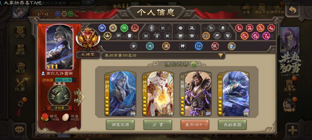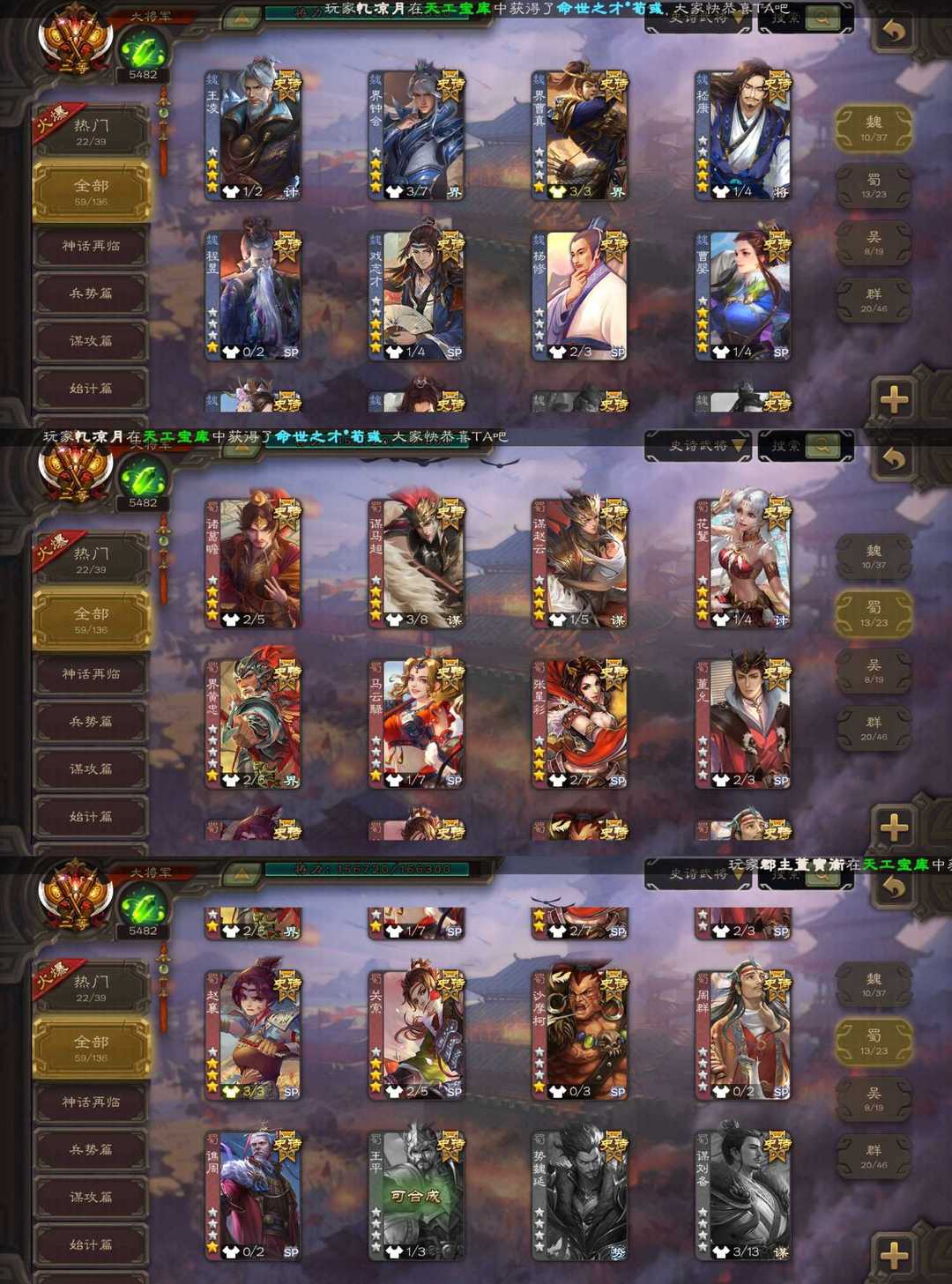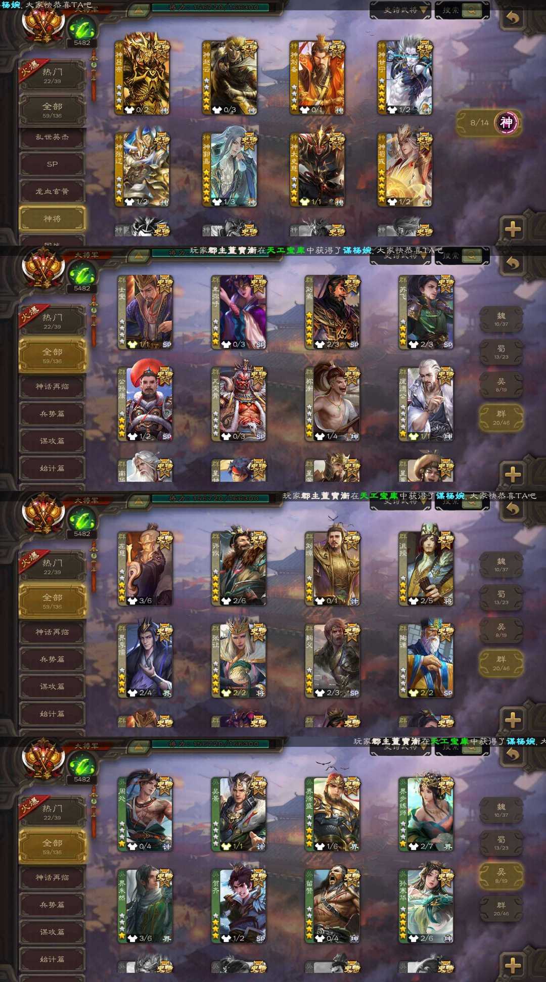 装备描述:【三卡充足】v11大将军⚡双形态神郭嘉动态神荀彧动态刘焉动态神甘宁⚡至尊界钟会⚡动态曹婴⚡奇门孙寒华⚡神刘备⚡