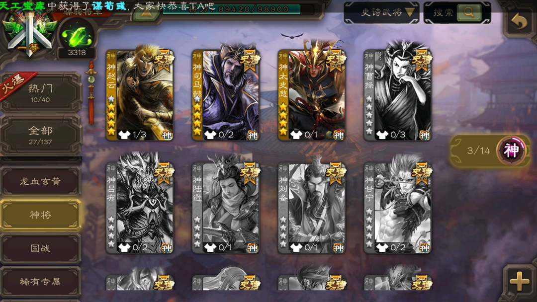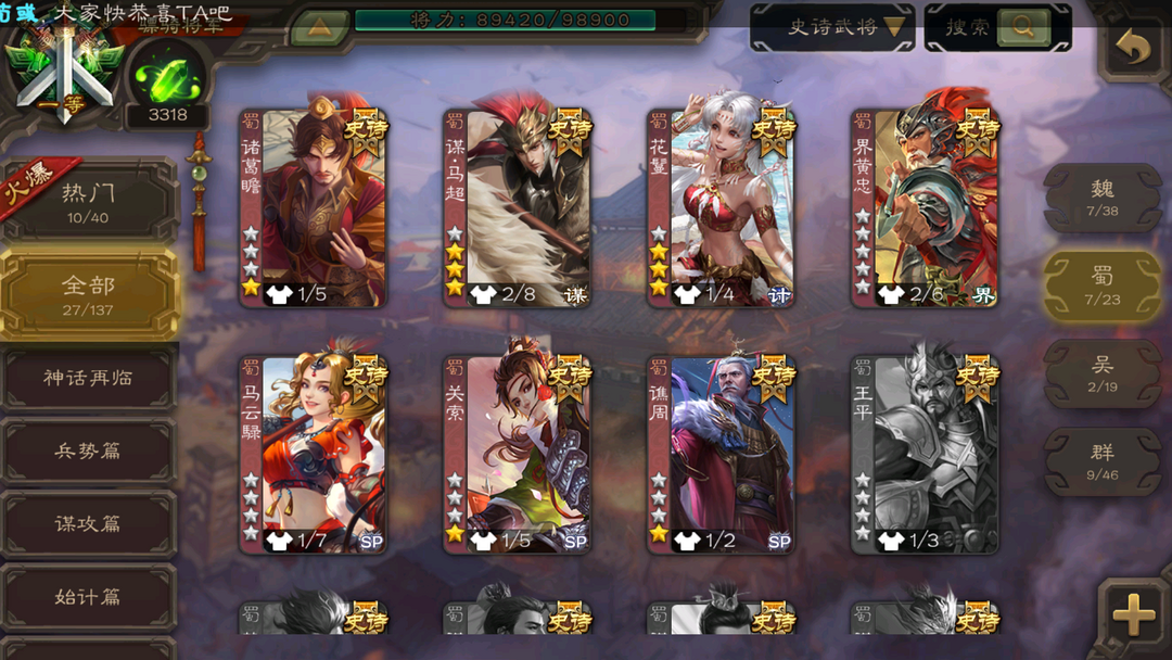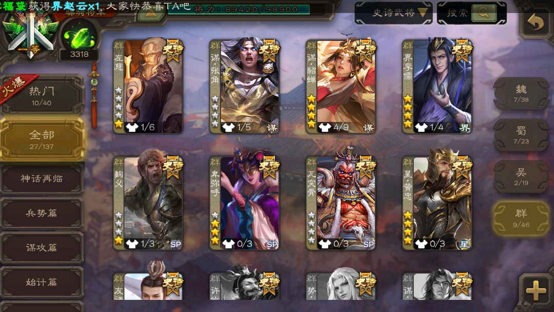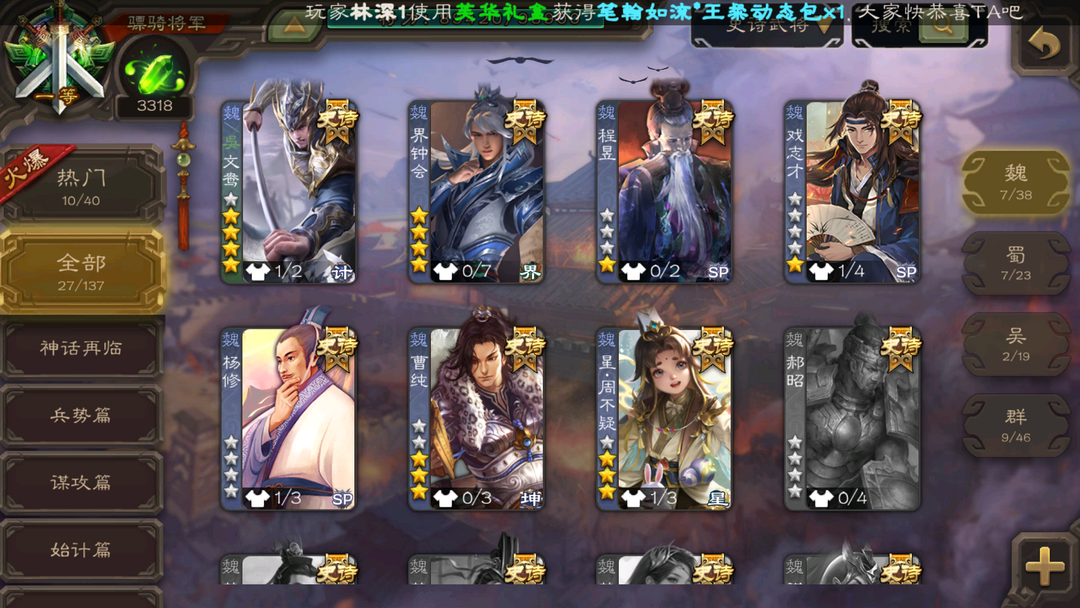 限制: 撤单率<50%才可租用此帐号装备描述:大将军曹髦动谋曹丕谋诸葛亮双形态界钟会动神甘宁马钧裴秀杜预老仙谋曹操41史诗界左慈
