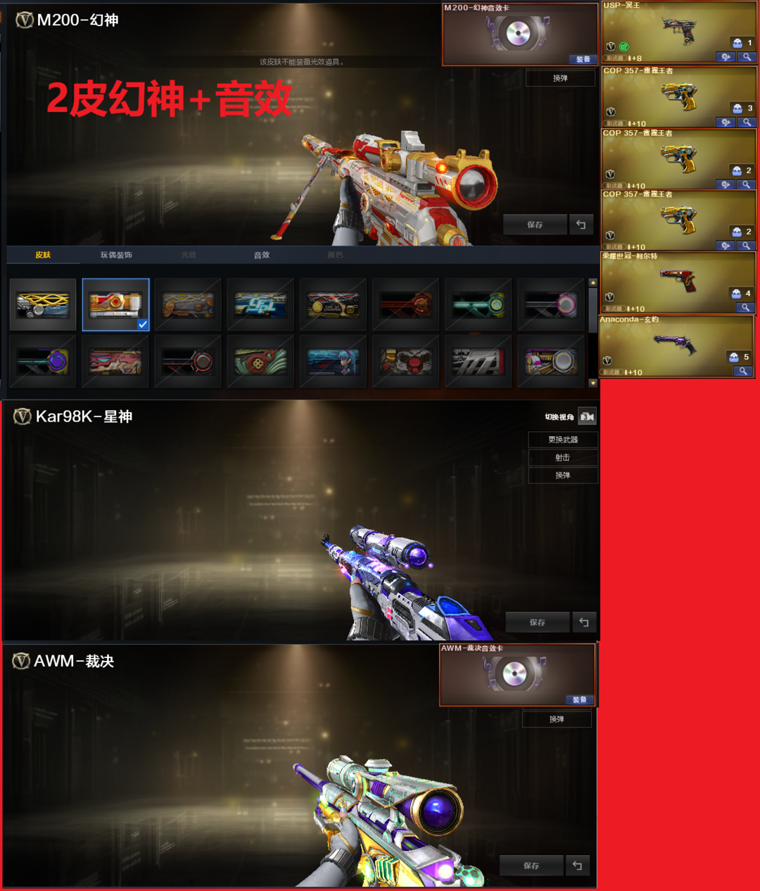 装备描述:排位:可以、、、、、、、、、、、、、、、爆破四防:幻神2皮+音效(24AG冠军、周瑜皮肤)98K星神、USP冥王、3个COP雷霆王者、世冠柯尔特、白虎、QBZ金色蔷薇、、、幻神音效、裁决音效、、、1套玄豹、4套雷霆王者、、、爆破四防(传说女帝、玄豹、王者春、职业经理)