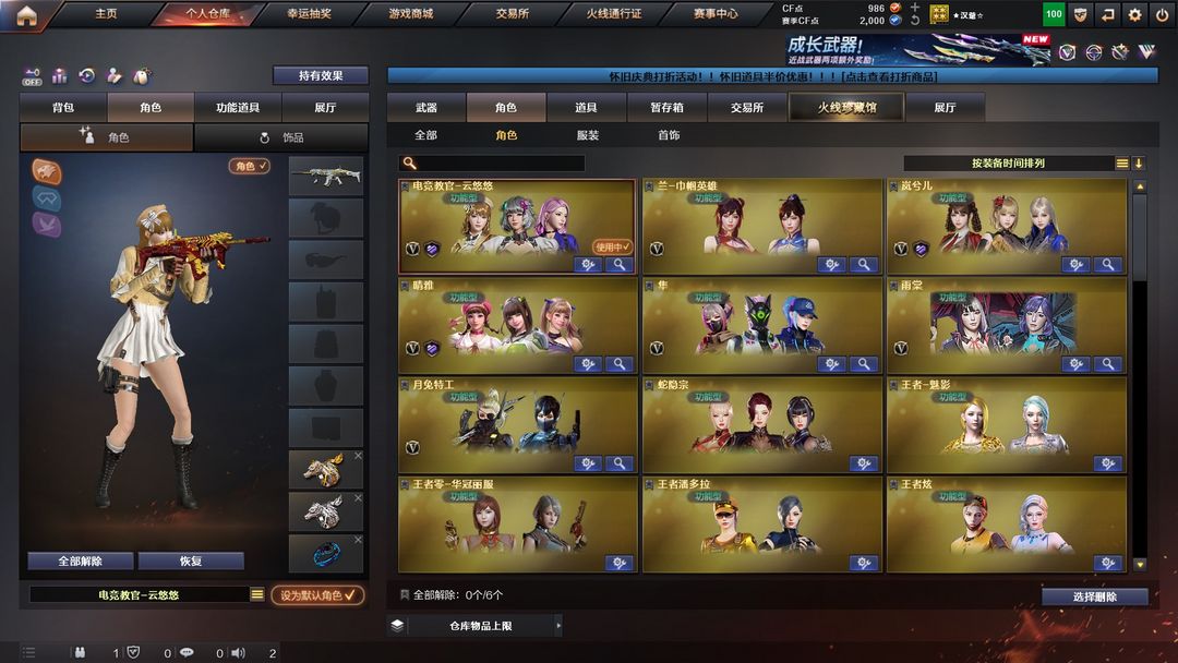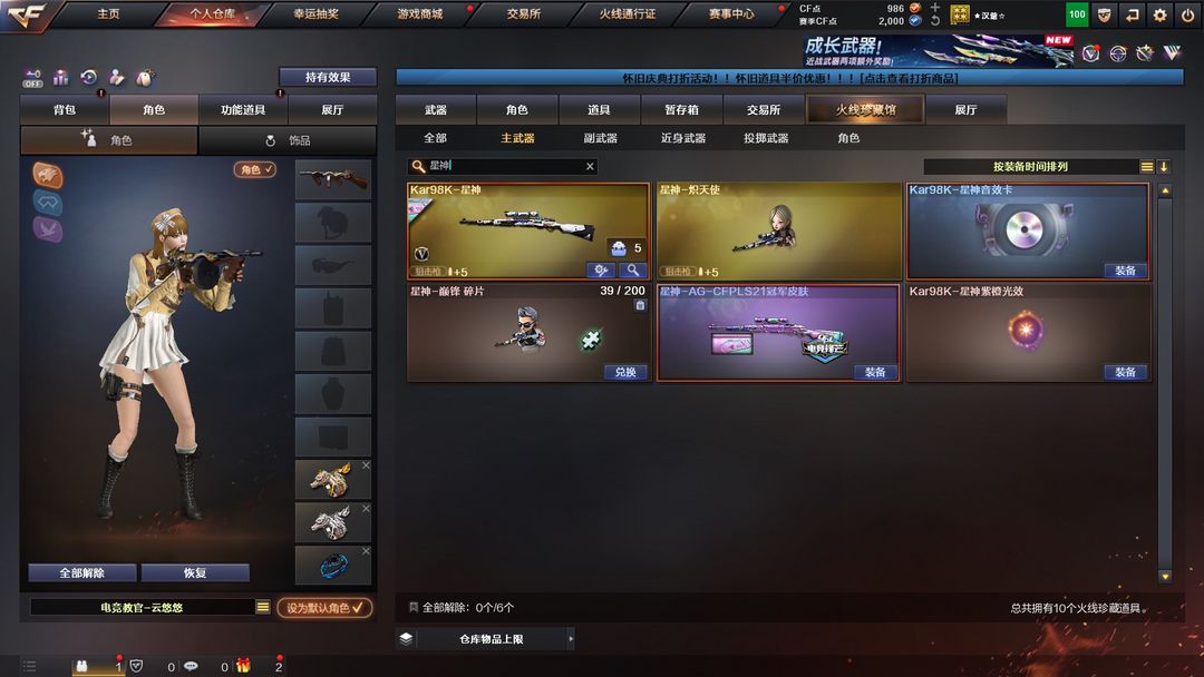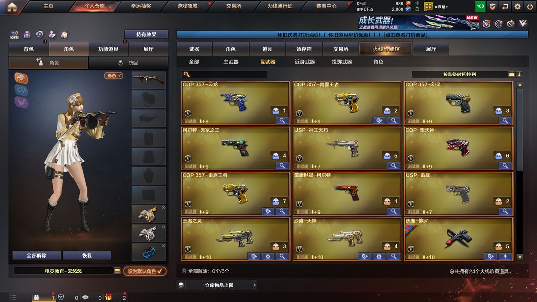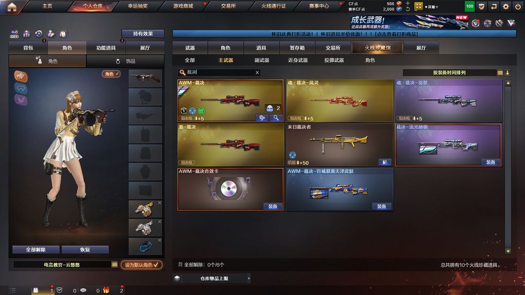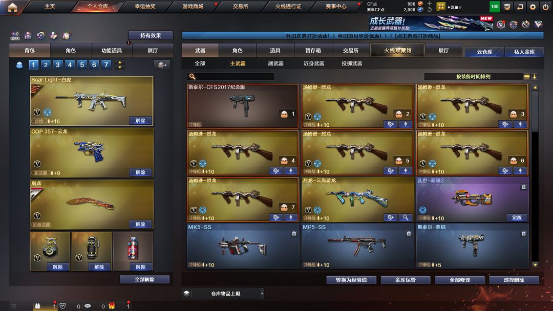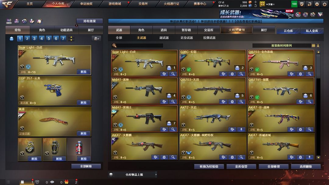 装备描述:王者武器:炫金无影;COP 357-雷霆王者-觉醒版;M4A1-雷霆王者-觉醒版;雷霆王者之锋-觉醒版;烟雾弹-雷霆王者-觉醒版;高爆手雷-雷霆王者;闪光弹-雷霆王者-觉醒版;王者之灵-觉醒版;王者之武-觉醒版;炫金雷神;王者之怒-觉醒版 英雄武器:G36C-幻影;M200-幻神;USP-雷暴;高爆手雷-竞技荣光;擎天-竞技荣光;M4A1-黑骑士;柯尔特-无冕之王;荣耀世冠-柯尔特;荣耀世冠-龙啸;沙鹰-天神;M4A1-龙血;M4A1-猎神;RPK-盘龙;龙啸-热带奇洋;超新星-热带奇洋;COP 357-云龙;手雷-热带奇洋;黑武士-锦绣游龙;传说破晓;黑骑士-海王;烈龙-云海游龙;Scar Light-白虎;擎天-云海游龙;手雷-云海游龙;AK47-火麒麟;COP 357-幻灵;AN94-超新星;烈火-动感闪耀;屠龙-动感闪耀;天神-动感闪耀;手雷-动感闪耀;无影-神兵利器;USP-神工天巧;高爆手雷-神工天巧;唐刀-神工天巧;炽芒蝶刃;9A91-烈火;AA-12-雷霆;Kar98K-星神;QBZ03-天罚;QBZ03-金色蔷薇;烟雾弹-竞技荣光;闪光弹-竞技荣光;沙鹰-修罗;马来剑