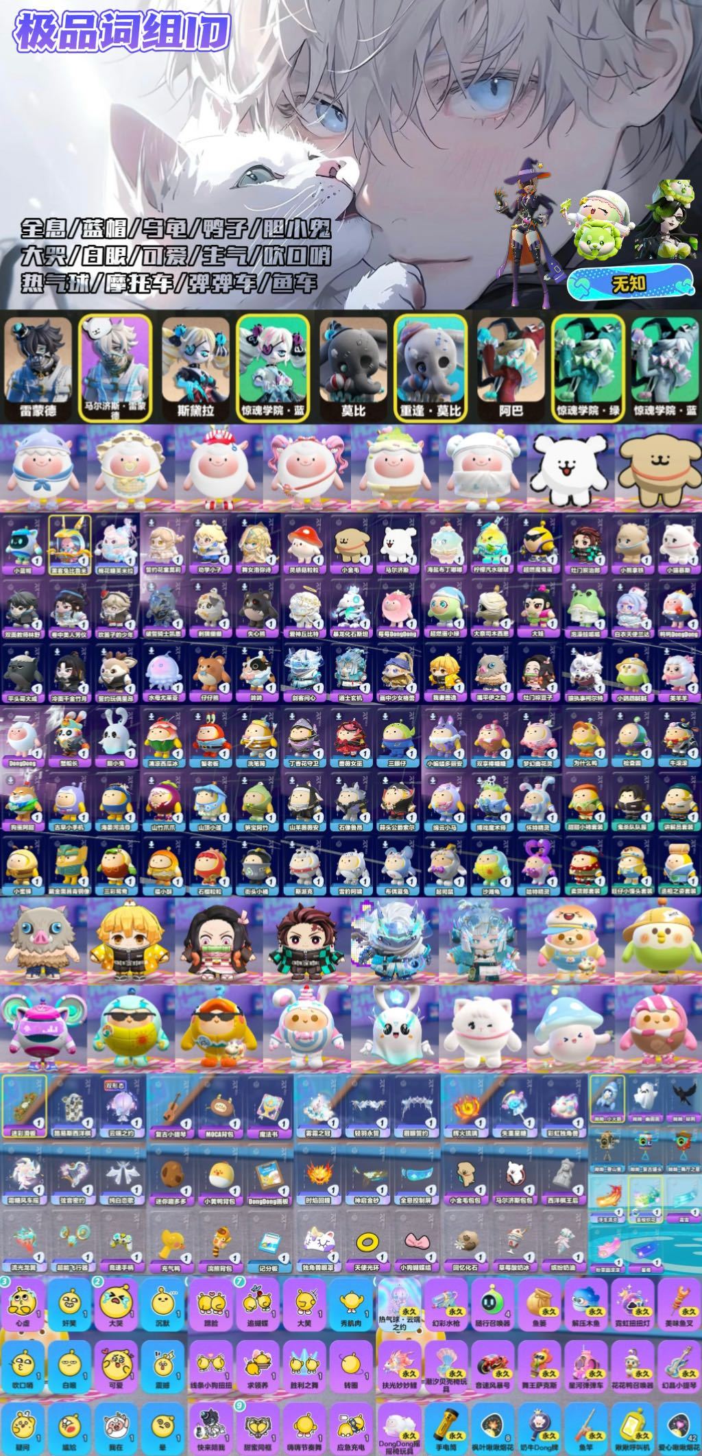 词组id无知/线条小狗小羊全衣橱/古早蓝帽为什么鸭沙滩龟大哭全息热气球摩托鬼灭旺仔惊魂夜全角色