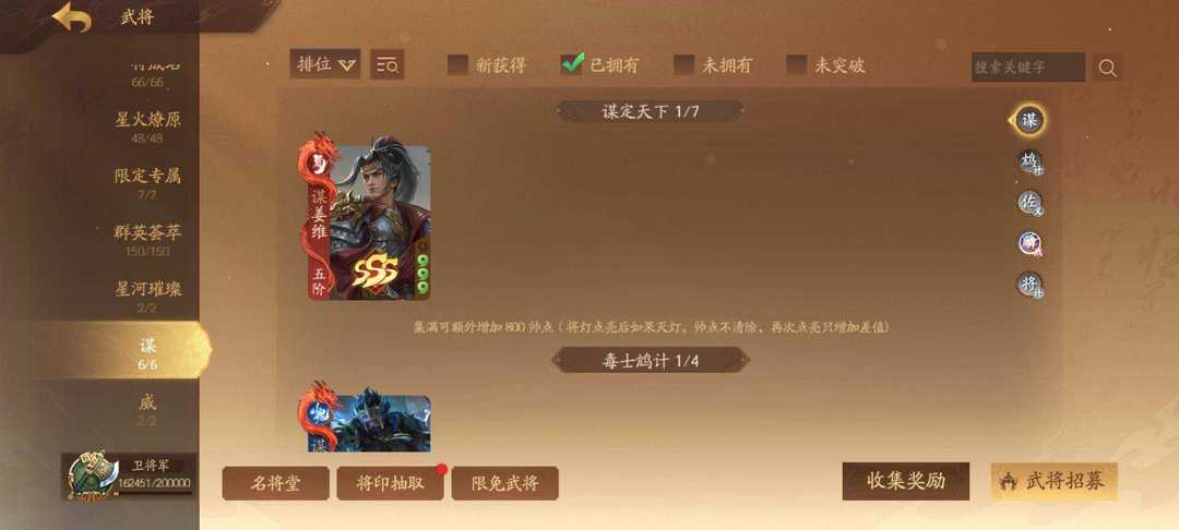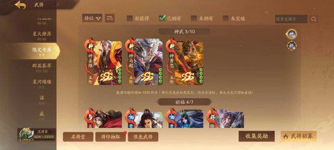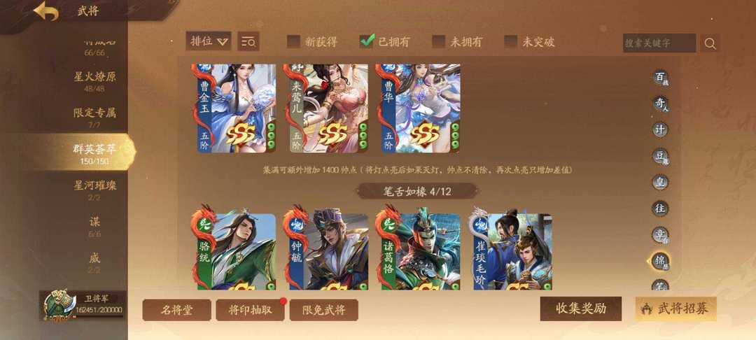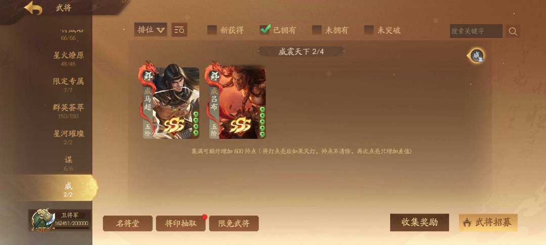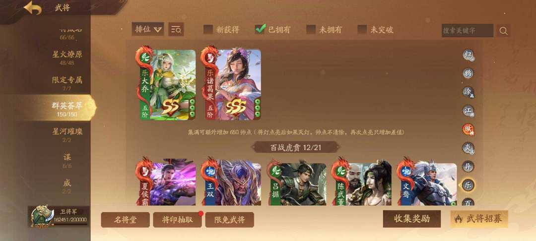 装备描述:367将卫将军 威马超 威吕布 谋姜维 神黄忠 神马超(限)任婉 刘衿刘佩(限)谋邓艾传 谋胡烈 谋典韦 谋刘协 乐诸葛果 乐大乔 崔令仪 钟毓 周宣 黄舞蝶 庞宏 吕玲绮冰魄动 许劭动 管宁 星孙尚香传 星孙坚 曹金玉 曹华动 张奂 孙綝 李谢 关宁 张宁动 陈珪 黄承彦 吕据 文钦 胡遵 蒲沅限 赵昂 郭照限动 陈式 孙礼 马均 关锁 曹纯 徐荣 曹婴限