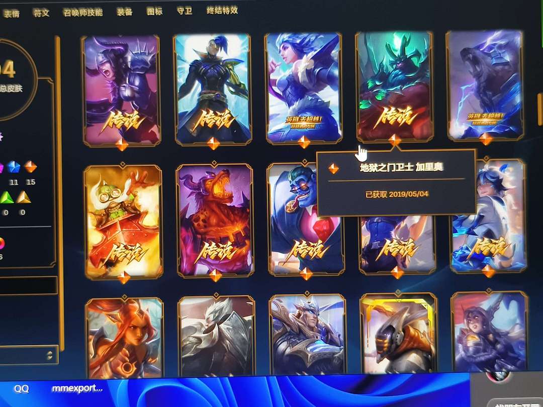 装备描述:104个皮肤,2个神话皮,15个传说皮,19个史诗皮,11个限定皮
