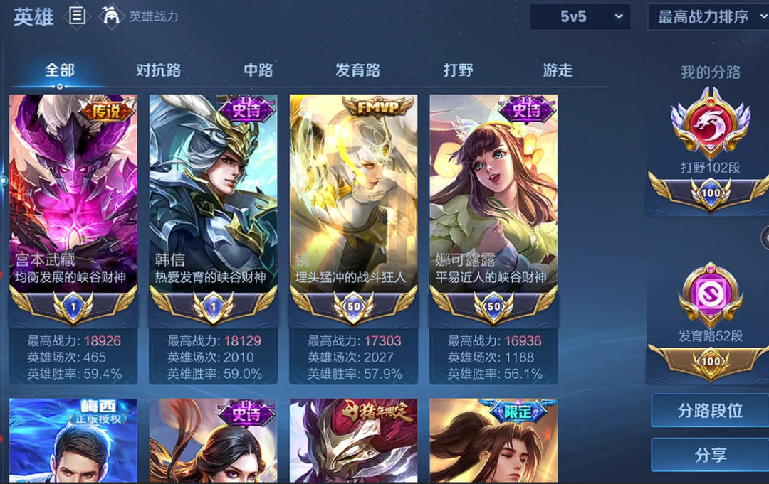 打野100段⭐历史国服最强宫本武藏国服最强韩信国服露娜⭐发育路52段⭐5典藏银白咏叹调鸣剑曳影觅芳踪