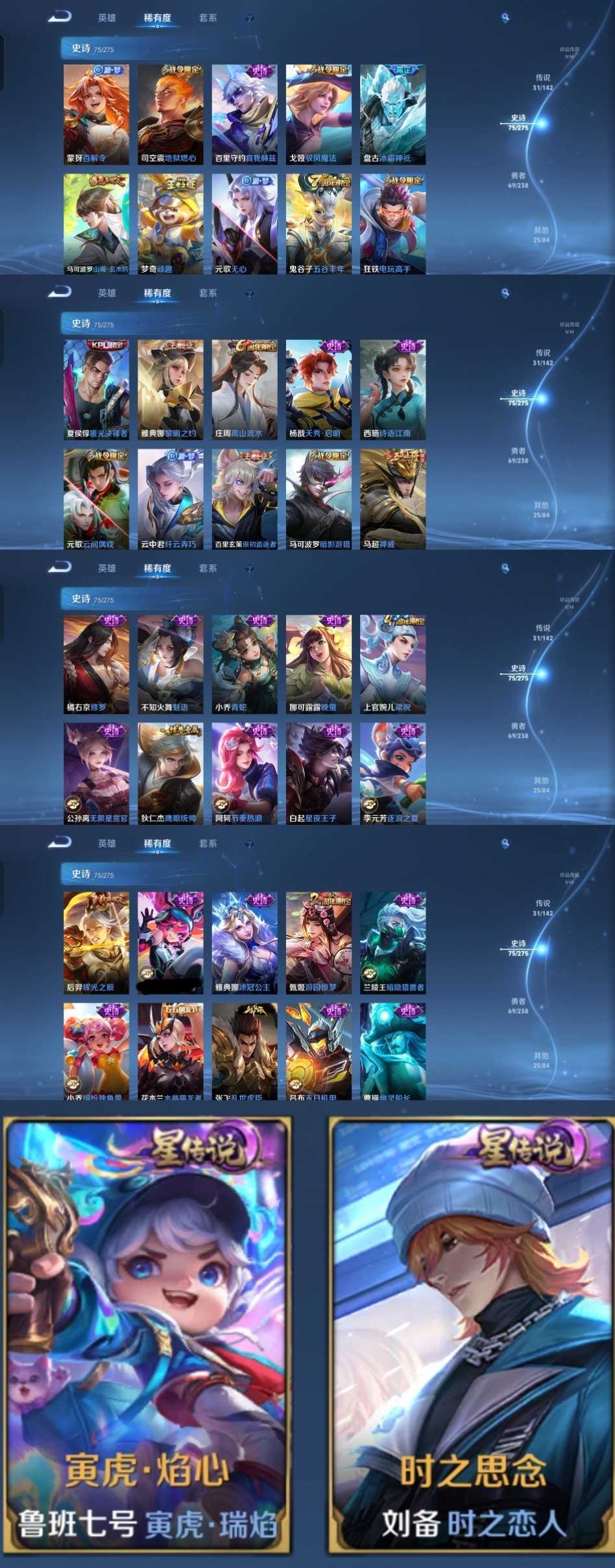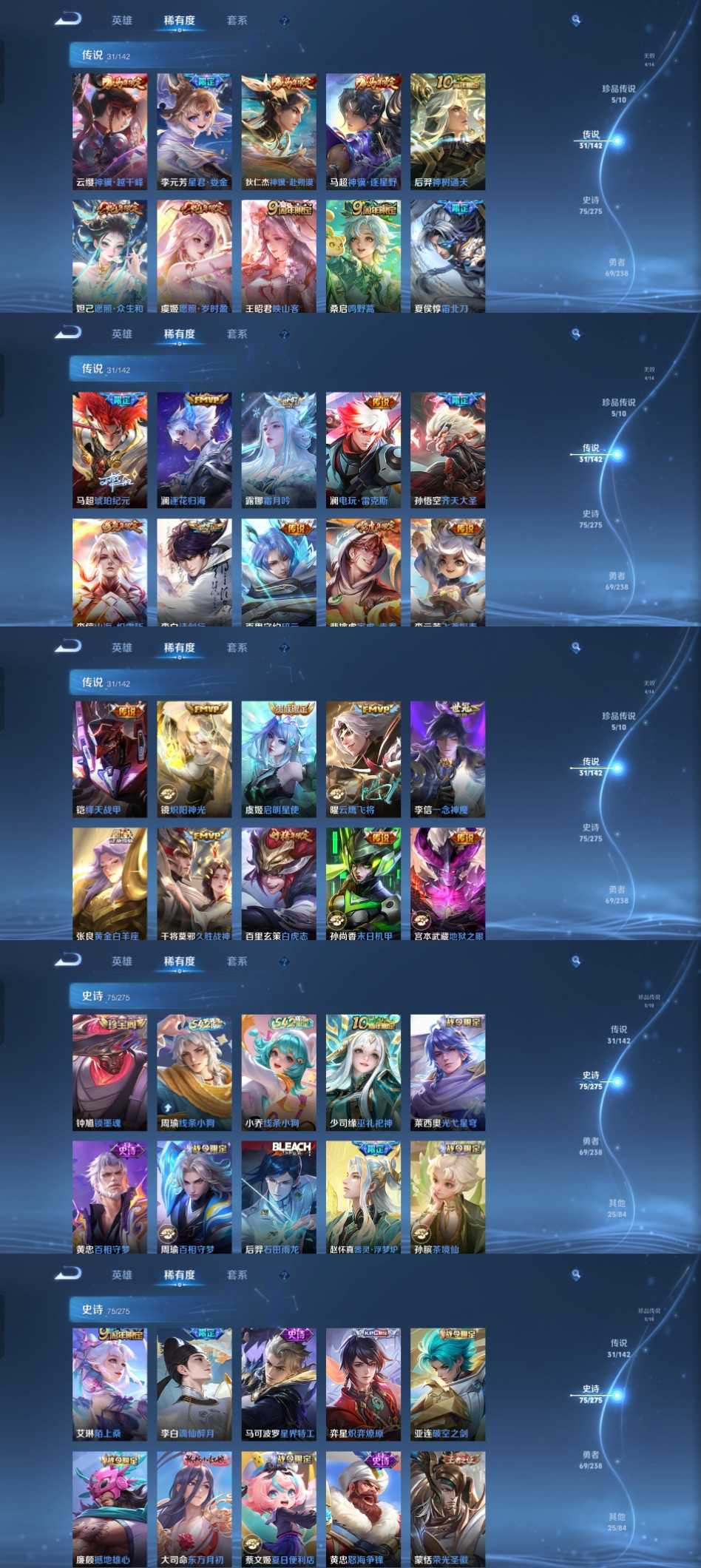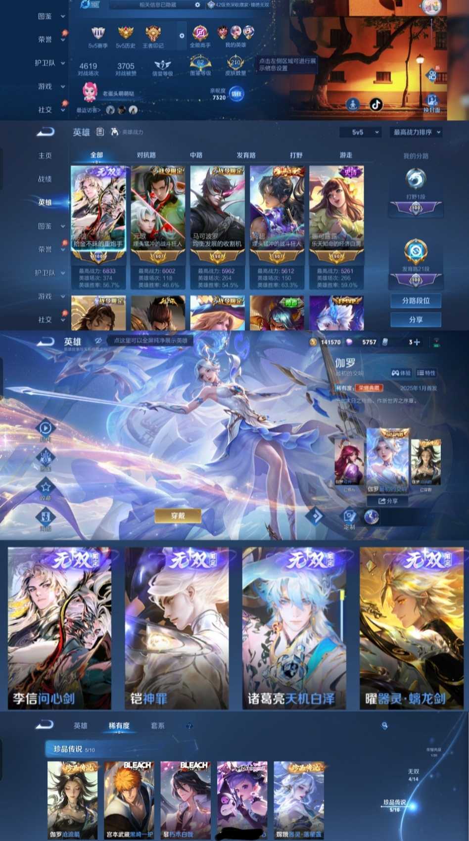 5无双6珍品31传说✨国服李信✨问心剑苍流箭✨越千峰赴朔漠✨逐星野神罪✨天机白泽黑崎一护✨朽木白哉