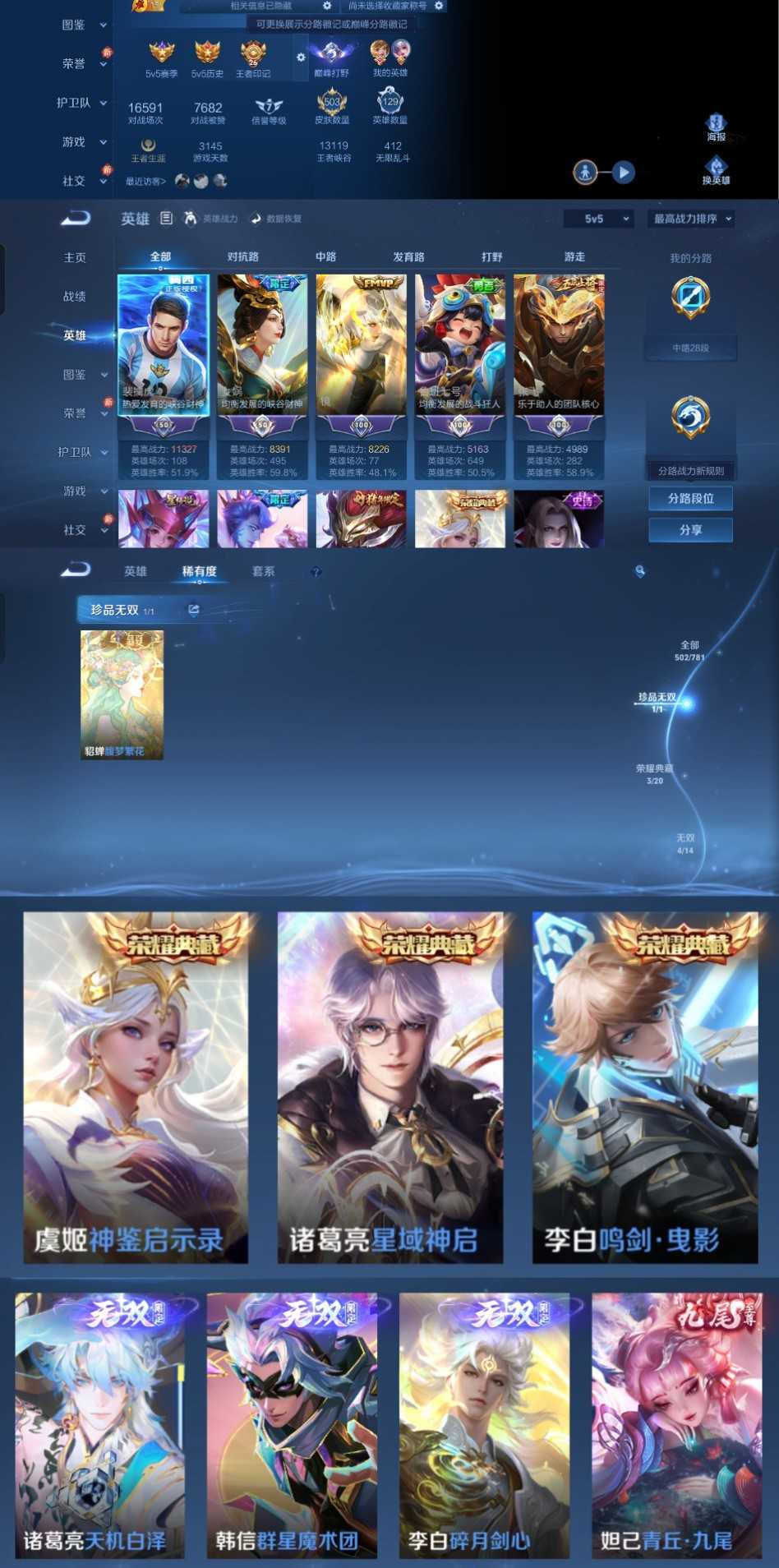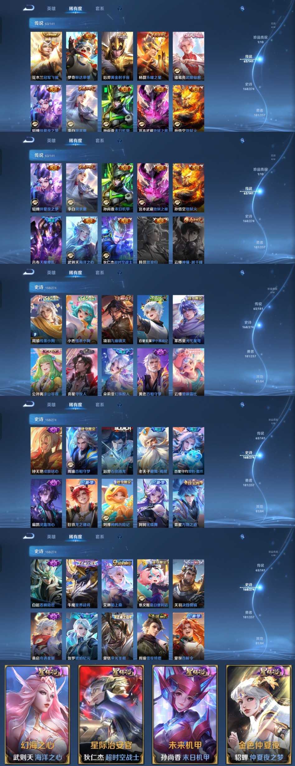 限制: 租号2次及以上 | 撤单率<49%才可租用此帐号装备描述:时间到了还登录白玩或者顶号全部改密拉黑处理永不解除,顶号机器会秒禁玩改密,顶号不仅拉黑还没得玩,赚三两块不容易,请理解谢谢。 ❤❤❤❤❤❤❤❤❤❤❤❤❤❤❤❤❤❤ 请勿开挂,挂机,送头,骂人,撤单后游戏等如有违规永久拉黑永不解除。 重置二级密码不要费劲了,号主每天都会上号查看,多行不义必自毙,人在做天在看,多做好事多自律,少做缺德事。 该号英雄129个皮肤503个,珍品无双1个,典藏4个,无双4个,珍品传说1个,星传说4个,传说63个,史诗168个,祝你游戏愉快