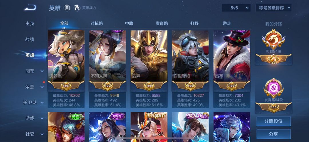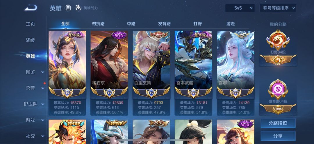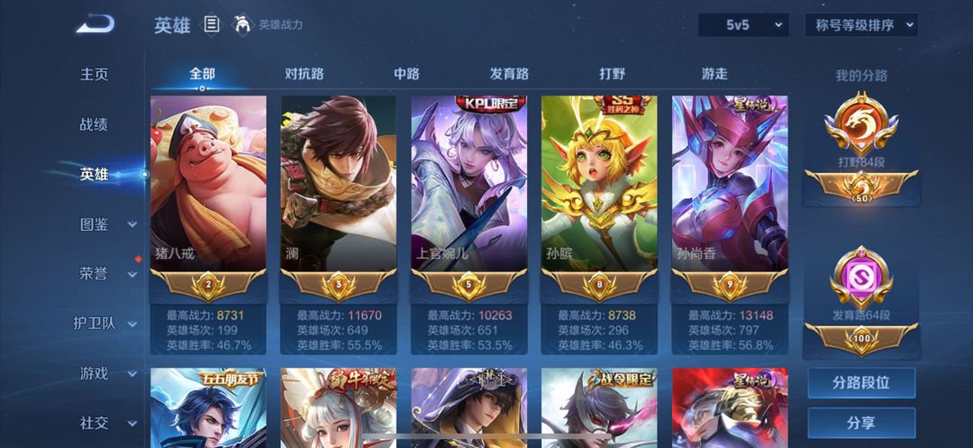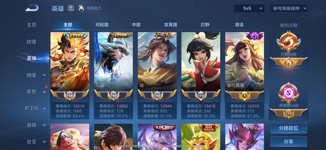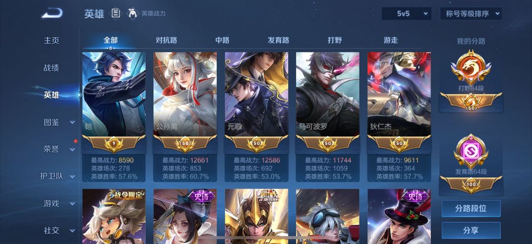 84段打野巅峰❤国服镜,露娜,老虎❤9个帅国标❤马超❤诸葛亮无双❤发育路64段