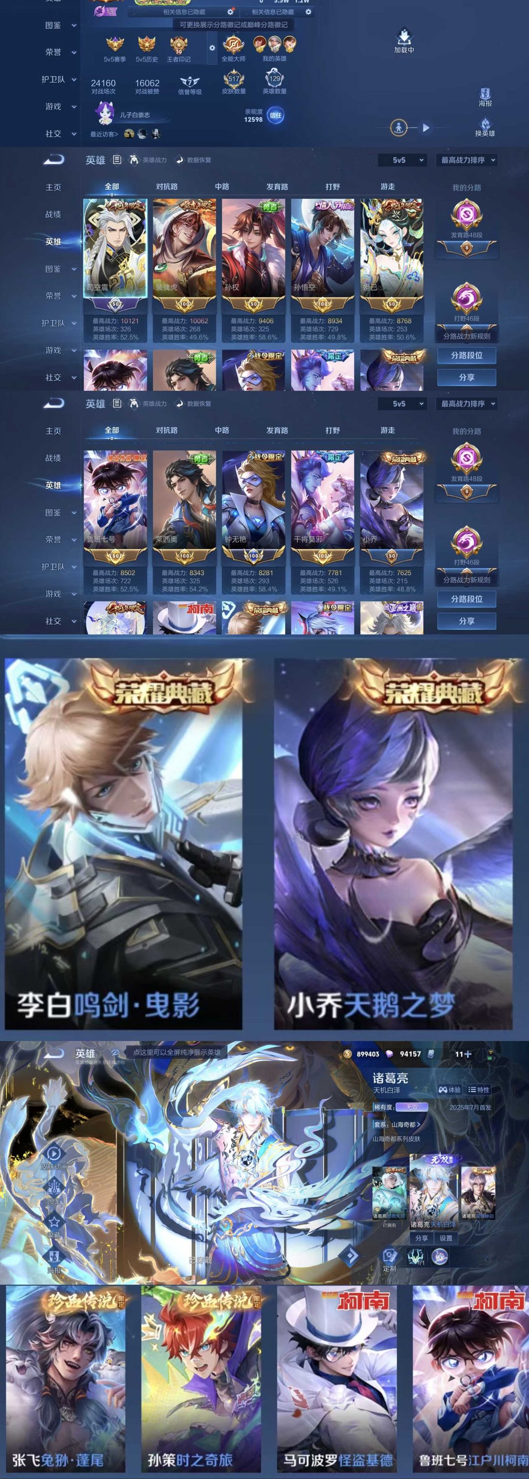 限制: 租号2次及以上 | 撤单率<49%才可租用此帐号装备描述:时间到了还登录白玩或者顶号全部改密拉黑处理永不解除,顶号机器会秒禁玩改密,顶号不仅拉黑还没得玩,赚三两块不容易,请理解谢谢。 ❤❤❤❤❤❤❤❤❤❤❤❤ 请勿开挂,挂机,送头,骂人,撤单后游戏等如有违规永久拉黑永不解除。 重置二级密码不要费劲了,号主每天都会上号查看,多行不义必自毙,人在做天在看,多做好事多自律,少做缺德事 该号英雄129个皮肤517个,典藏3个,无双1个,珍品传说4个,星传说3个,传说56个,史诗170个,祝你游戏愉快~