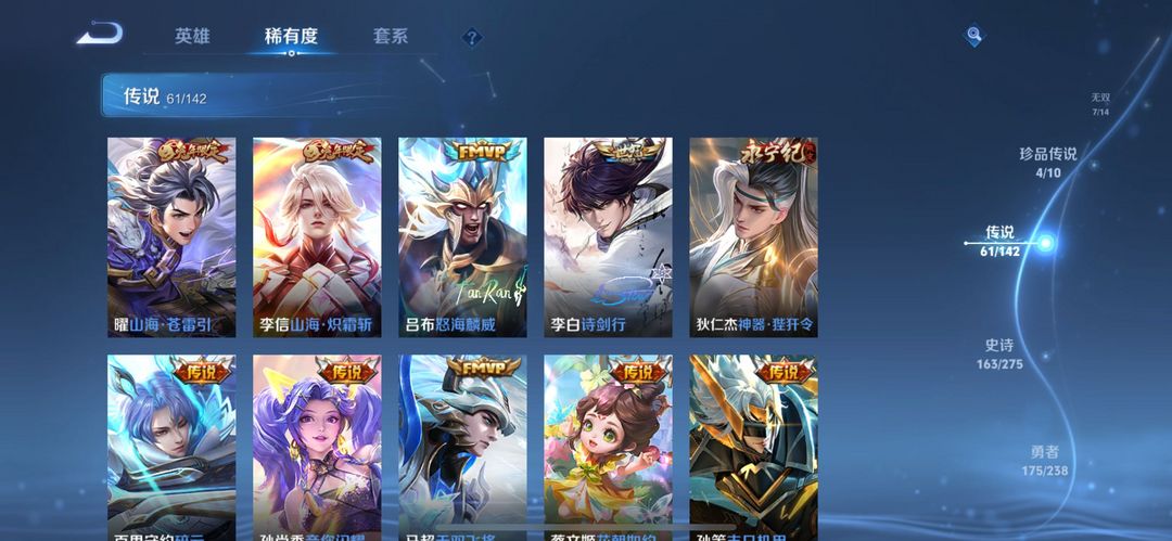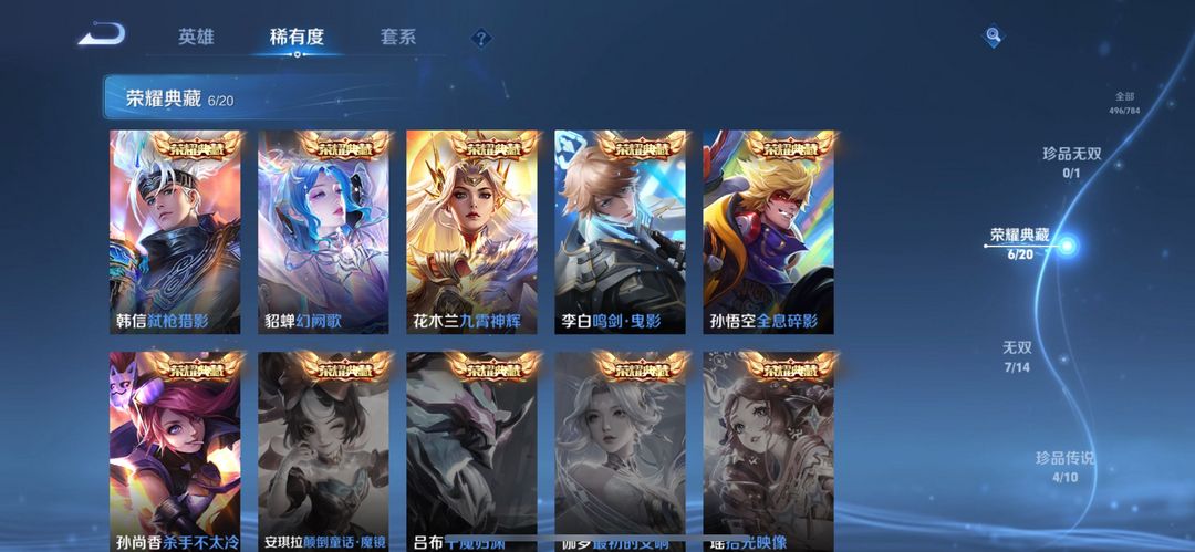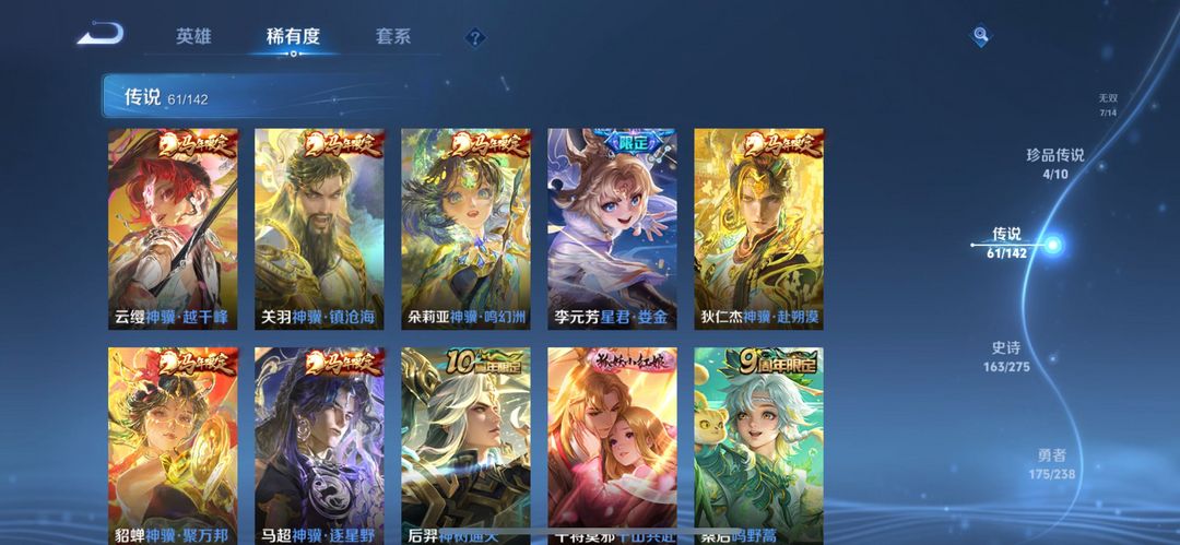 无双贵族⚡8典藏⚡7无双⚡5珍品⚡猴子无双⚡李信无双⚡凯无双⚡满马限⚡伽罗珍品⚡70传说皮⚡5星传说