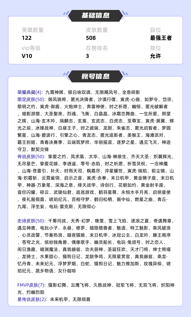 限制: 租号1次及以上 |装备描述:>>>>>>毁号,涉及毁坏虚拟财产罪及计算机安全罪,请文明游戏素质游戏,让我们共建美好租号平台>>>>>> 本游戏账号: V10用户,基础段位:至尊星耀V,英雄多,皮肤多。铭文:0-10,典藏皮肤4个,感受典藏皮肤带来的优质体验快感,FMVP皮肤7个,尽情享受FMVP皮肤带来的主角光环, 私人所属英雄皮肤有:夏侯惇 无限飓风号||孙悟空 全息碎影||铠 银白咏叹调||花木兰 九霄神辉花木兰 燃星之曲||亚瑟 追逃游戏||上官婉儿 神器·万象笔||安琪拉 追逃游戏||曜 山海·苍雷引||瑶 时之祈愿||貂蝉 遇见胡旋||兰陵王 影龙天霄||吕布 遇见神鼓||诸葛亮 时雨天司||女娲 补天||妲己 青丘·九尾||铠 绛天战甲||马超 琥珀纪元||橘右京 枫霜尽||孙策 末日机甲||伽罗 太华||百里守约 碎云||蔡文姬 花朝如约||宫本武藏 地狱之眼||孙悟空 零号·赤焰||裴擒虎 寅虎·赤拳||小乔 山海·琳琅生||李信 山海·炽霜斩||李白 诗剑行||上官婉儿 妄想奇谈||露娜 霜月吟||大乔 挚爱花嫁||干将莫邪 画中仙||孙尚香 末日机甲||云缨 鹤归松栖||露娜 启示之音||鲁班