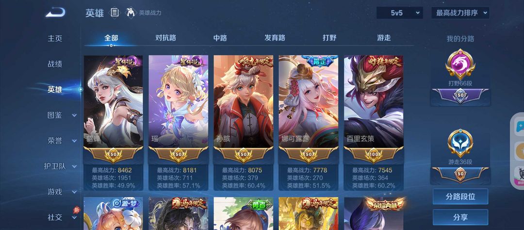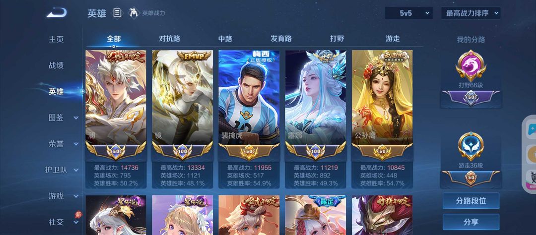 66段打野✨马年全秒✨国服镜,露娜,澜✨梅西,打野帅皮肤多