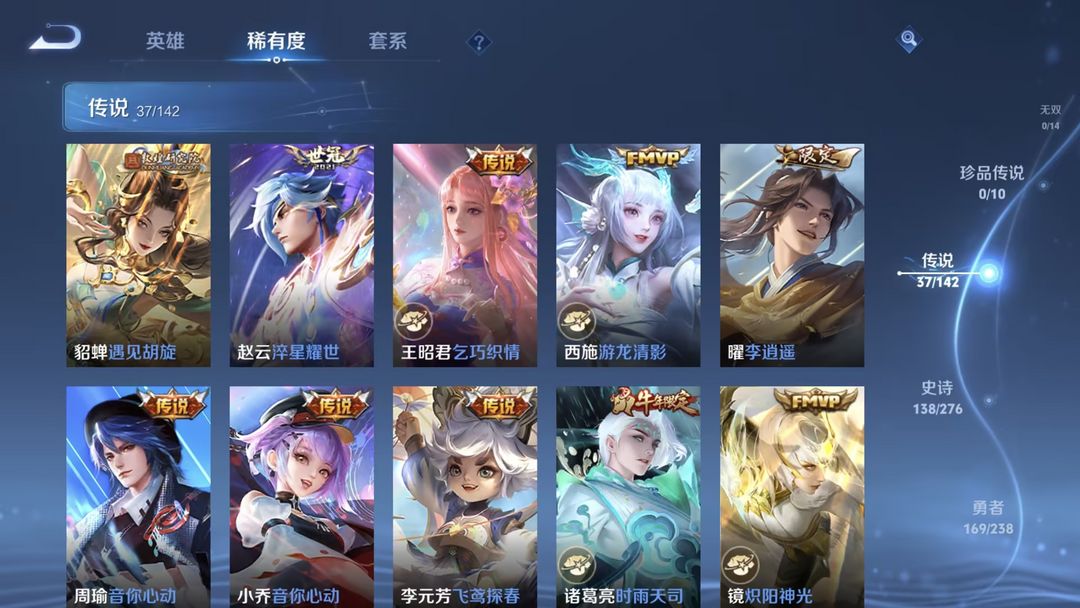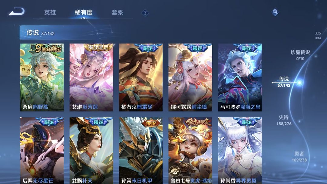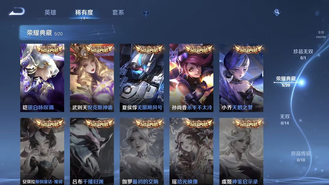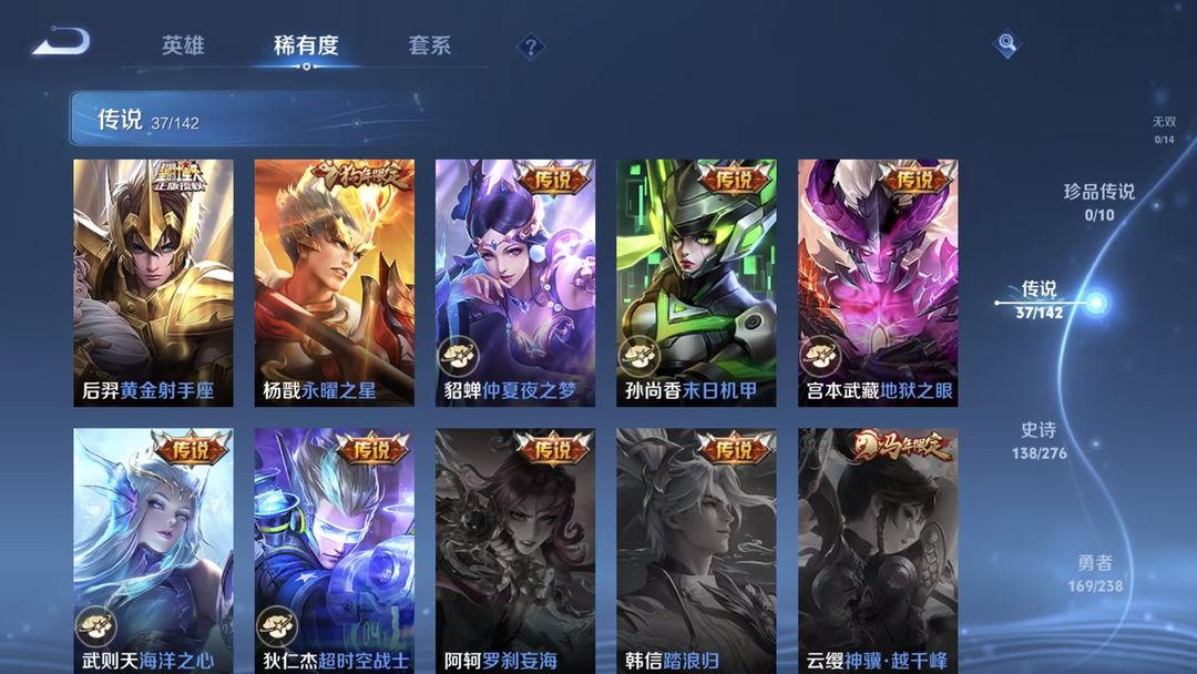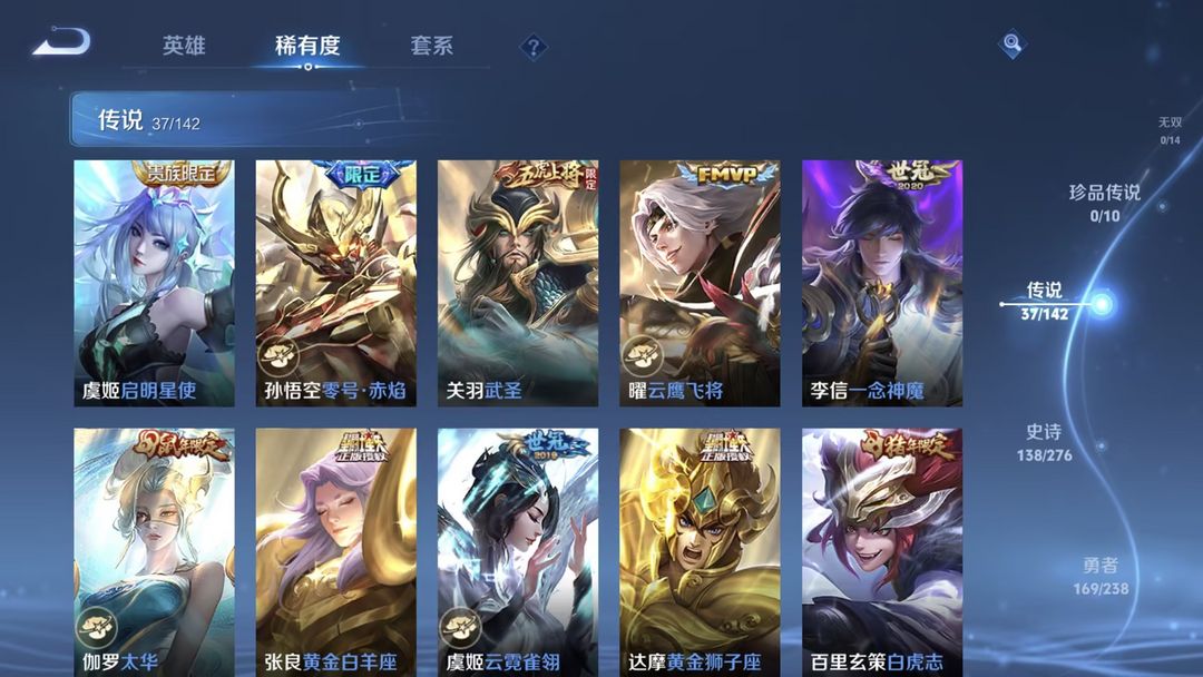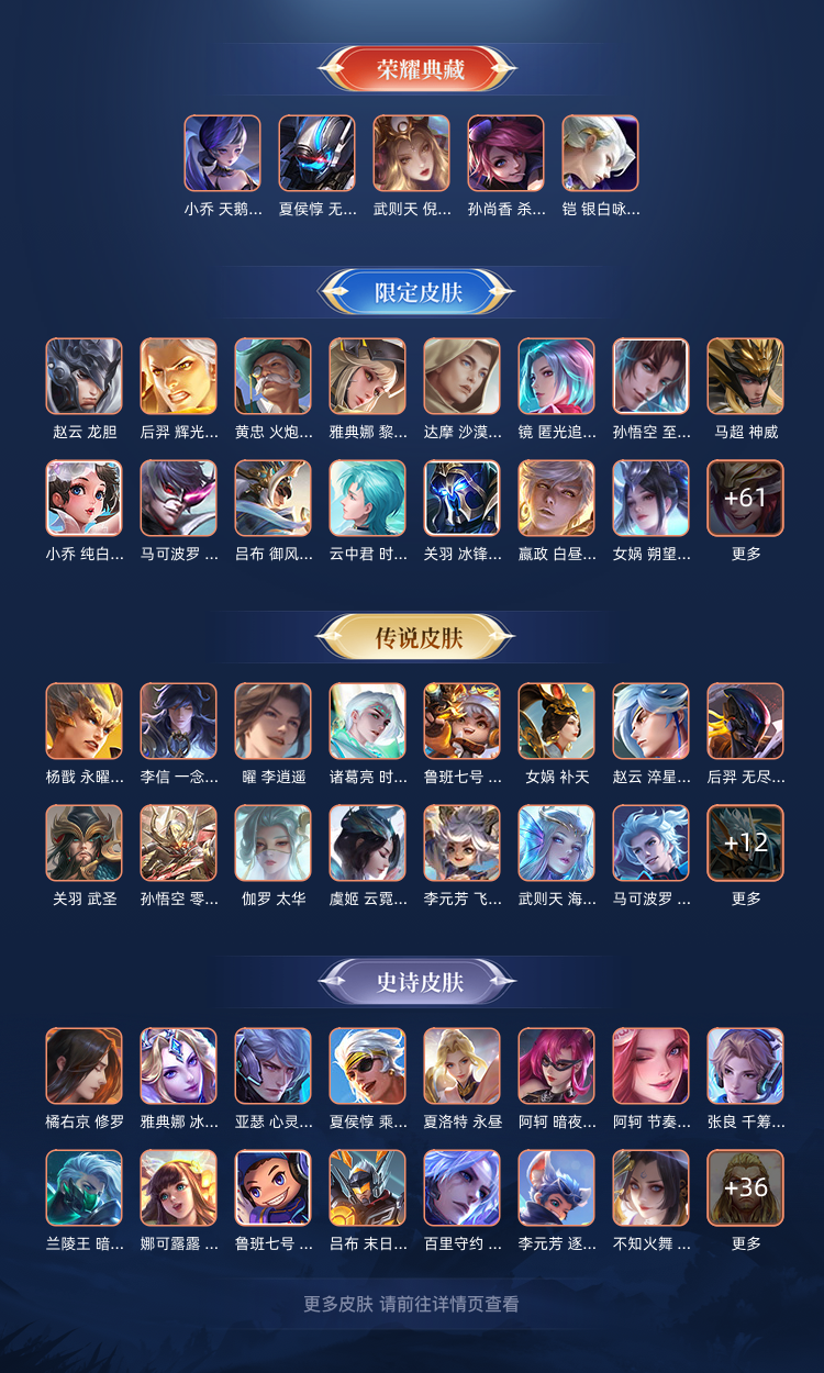 装备描述:荣耀水晶:银白咏叹调/无限飓风号/杀手不太冷/天鹅之梦/倪克斯神谕 传说皮肤:觅芳踪/枫霜尽/前尘镜/深海之息/无尽星芒/补天/末日机甲(孙策)/寅虎·瑞焰/异界灵契/超时空战士(狄仁杰)/太华/遇见胡旋/淬星耀世/乞巧织情/游龙清影/炽阳神光/音你心动(小乔)/音你心动(周瑜)/黄金白羊座/飞鸢探春/时雨天司/零号·赤焰/启明星使/白虎志/黄金射手座/武圣/黄金狮子座/云鹰飞将/一念神魔/末日机甲(孙尚香)/云霓雀翎/地狱之眼/仲夏夜之梦/海洋之心/永曜之星 限定皮肤:驭风魔法/探海日志/玲珑珍味/时之奇旅(妲己)/天狼狩猎者/热情桑巴/唐三藏/时之祈愿(云中君)/傲雪梅枪/黎明之约/青春决赛季/女儿国国王/匿光追影者/拒霜思/青龙志/猪悟能/孙行者/天狼溯光者/神迹守卫(墨子)/冰锋战神/逐梦之光/云间偶戏/御风骁将/白晶晶/神奇女侠/狂想玩偶喵/朱雀志/大圣娶亲/原初追逐者/暗影游猎/龙胆/神威/天狼绘梦者/烈魂/至尊宝/银河之约/时之彼端/辉光之辰/星空之诺/圣诞老人/狮舞东方/神迹守卫(钟馗)/蓝屏警告/朔望之晖/美猴王/逐梦之星/纯白花嫁/逐梦之音 史诗皮