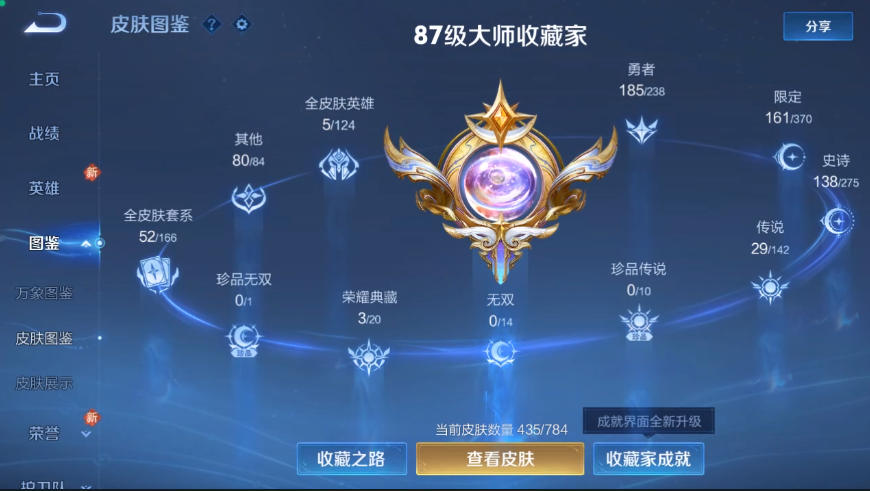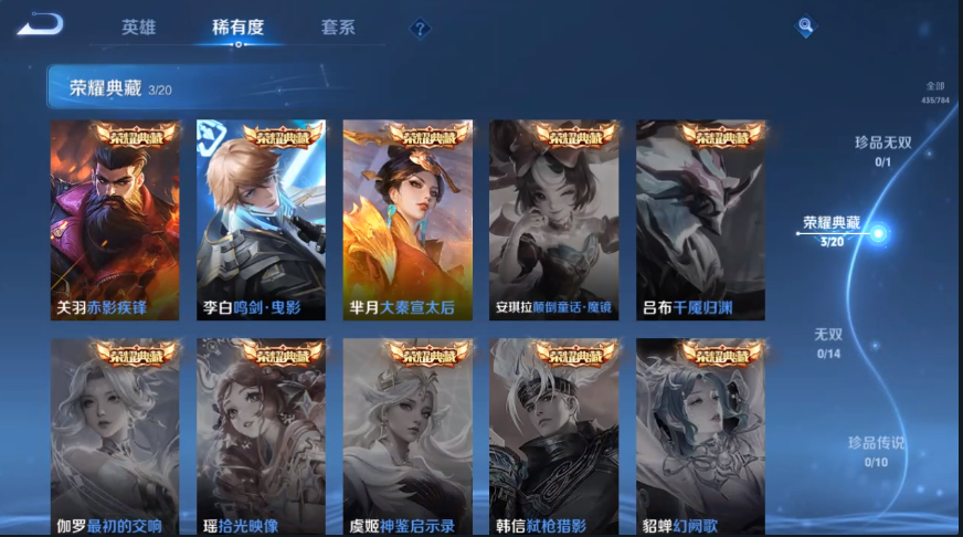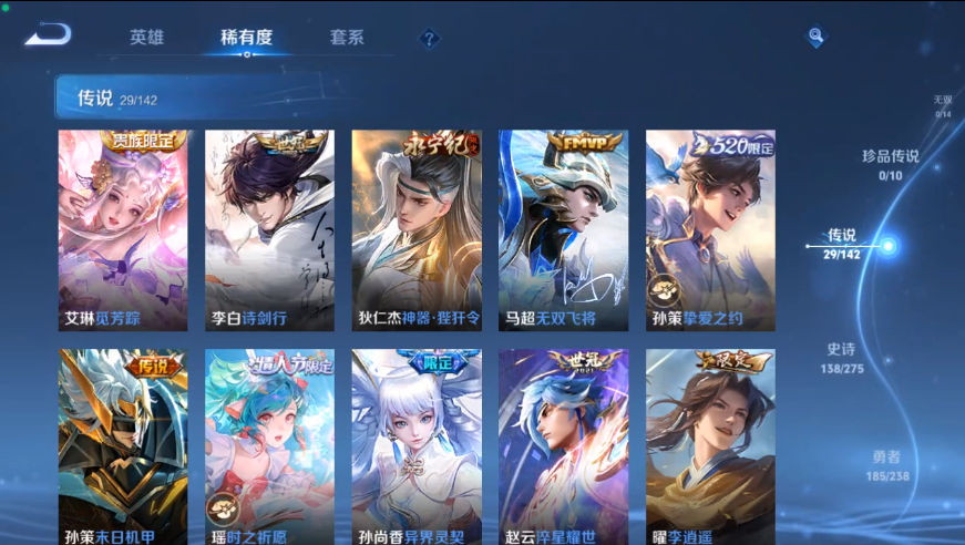 装备描述:408 荣耀水晶:赤影疾锋/鸣剑·曳影/大秦宣太后 传说皮肤:觅芳踪/地狱之眼/诗剑行/神器·狴犴令/无双飞将/挚爱之约/武陵仙君/末日机甲(孙策)/时之祈愿(瑶)/黄金狮子座/仲夏夜之梦/异界灵契/炽阳神光/淬星耀世/音你心动(周瑜)/启明星使/武圣/云鹰飞将/一念神魔/时之恋人(刘备)/胖达荣荣/天魔缭乱/太华/猫影幻舞/末日机甲(孙尚香)/久胜战神/地狱火/凤求凰 限定皮肤:雪夜绮愿/驭风魔法/探海日志/玲珑珍味/山海·玄木吟/降魔/圣诞老人/神奇女侠/唐三藏/匿光决锋者/玉兔公主/匿光追影者/时之祈愿(云中君)/寅虎·御盾/寅虎·展翼/傲雪梅枪/黎明之约/青春决赛季/拒霜思/猪悟能/孙行者/天狼溯光者/神迹守卫(墨子)/天狼运算者/冰霜恋舞曲/云间偶戏/原初追逐者/狂想玩偶喵/暗影游猎/神威/天狼绘梦者/烈魂/龙胆/至尊宝/银河之约/如梦令(后羿)/如梦令(嫦娥)/幽恒/星空之诺/飞衡/天狼征服者/狮舞东方/神迹守卫(钟馗)/蓝屏警告/朔望之晖/梅西/一生所爱/大圣娶亲/逐梦之影/朱雀志 史诗皮肤:箭羽风息/青蛇/猫狗日记(大乔)/暗夜贵公子/零食大作战/电玩·爆裂旋