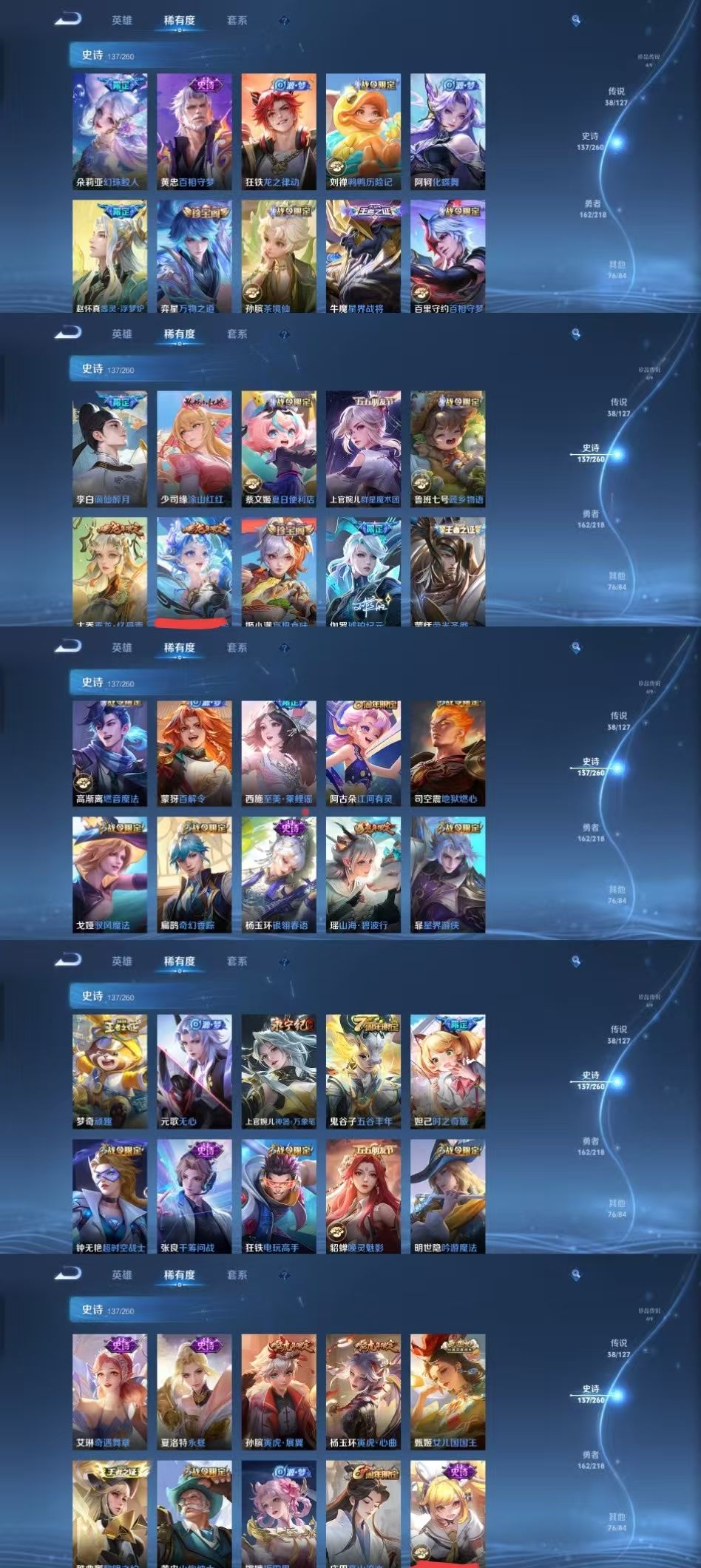限制: 撤单率<49%才可租用此帐号装备描述:时间到了还登录白玩或者顶号全部改密拉黑处理永不解除,顶号机器会秒禁玩改密,顶号不仅拉黑还没得玩,赚三两块不容易,请理解谢谢。 ❤❤❤❤❤❤❤❤❤❤❤❤❤❤❤ 请勿开挂,挂机,送头,骂人,撤单后游戏等如有违规永久拉黑永不解除。 重置二级密码不要费劲了,号主每天都会上号查看,多行不义必自毙,人在做天在看,多做好事多自律,少做缺德事。 该号英雄126个皮肤425个,珍品无双1个,典藏2个,无双3个,珍品传说4个,星传说2个,传说40个,史诗137个,祝你游戏愉快~