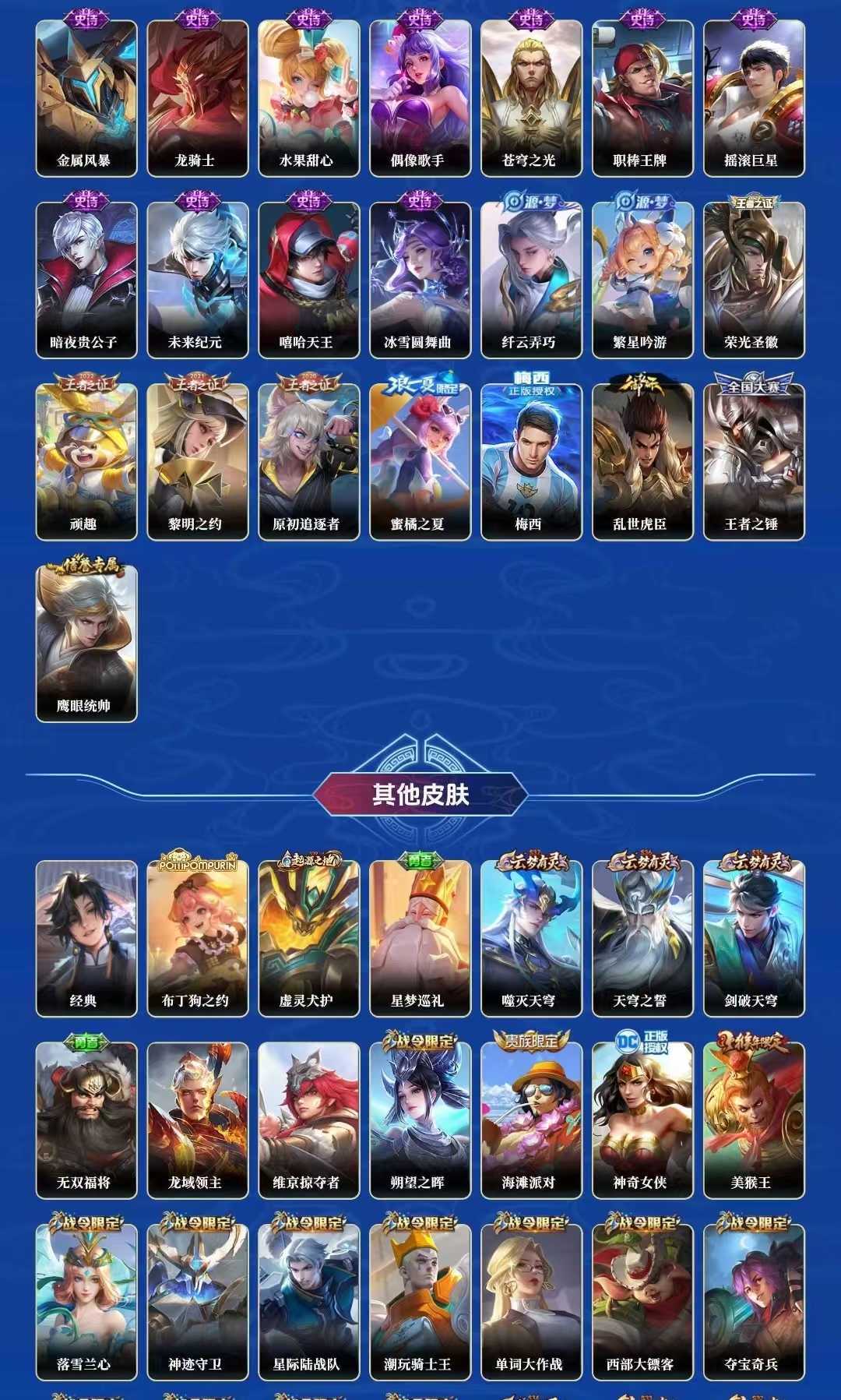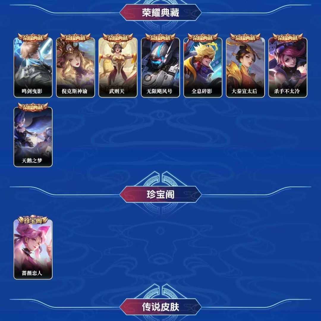 限制: 租号5次及以上 |装备描述:【C9】贵族V10~401皮8典藏37传说炽霜斩,祈雪灵祝,武圣,梅西,凤求凰,天魔缭乱,至尊宝,白虎志,神威【荣耀典藏】:倪克斯神谕,无限飓风号,杀手不太冷,天鹅之梦,鸣剑·曳影,全息碎影,大秦宣太后