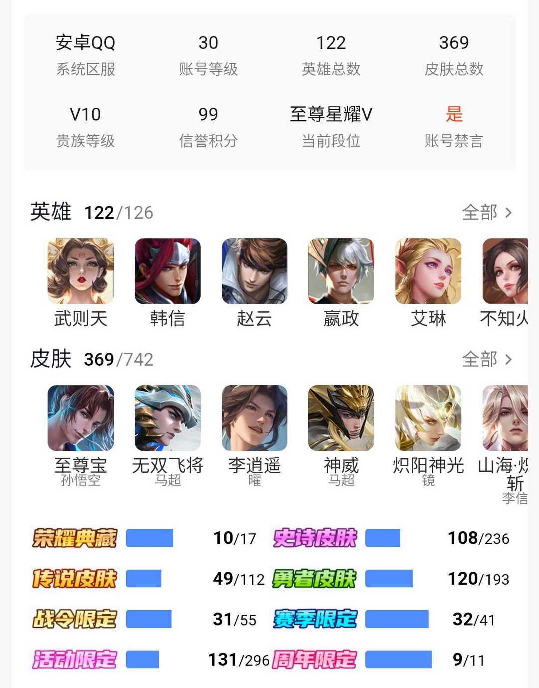 限制: 撤单率<50%才可租用此帐号装备描述:V10⭐️至尊宝无双飞将李逍遥神威炽阳神光山海·炽霜斩⭐️122英雄369皮肤/11水晶2星传说