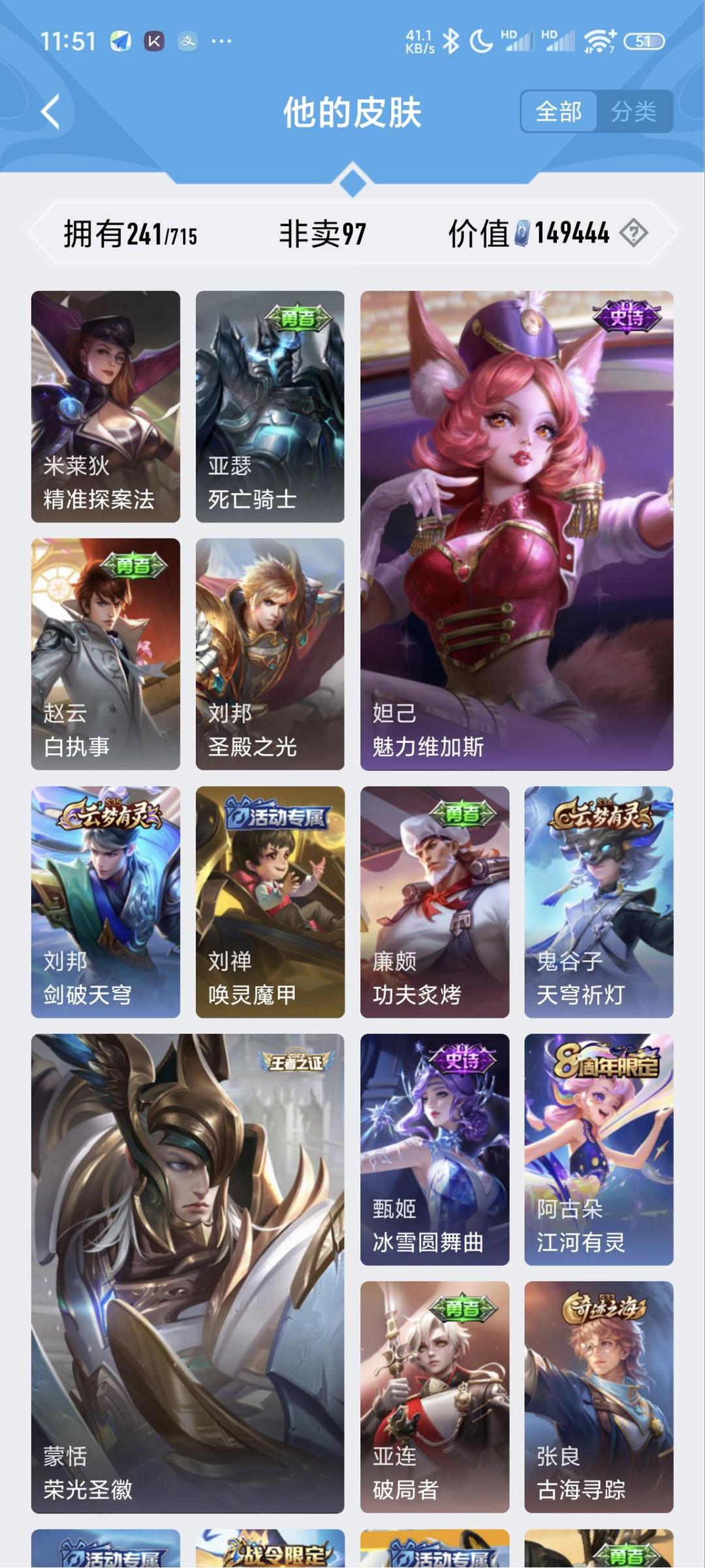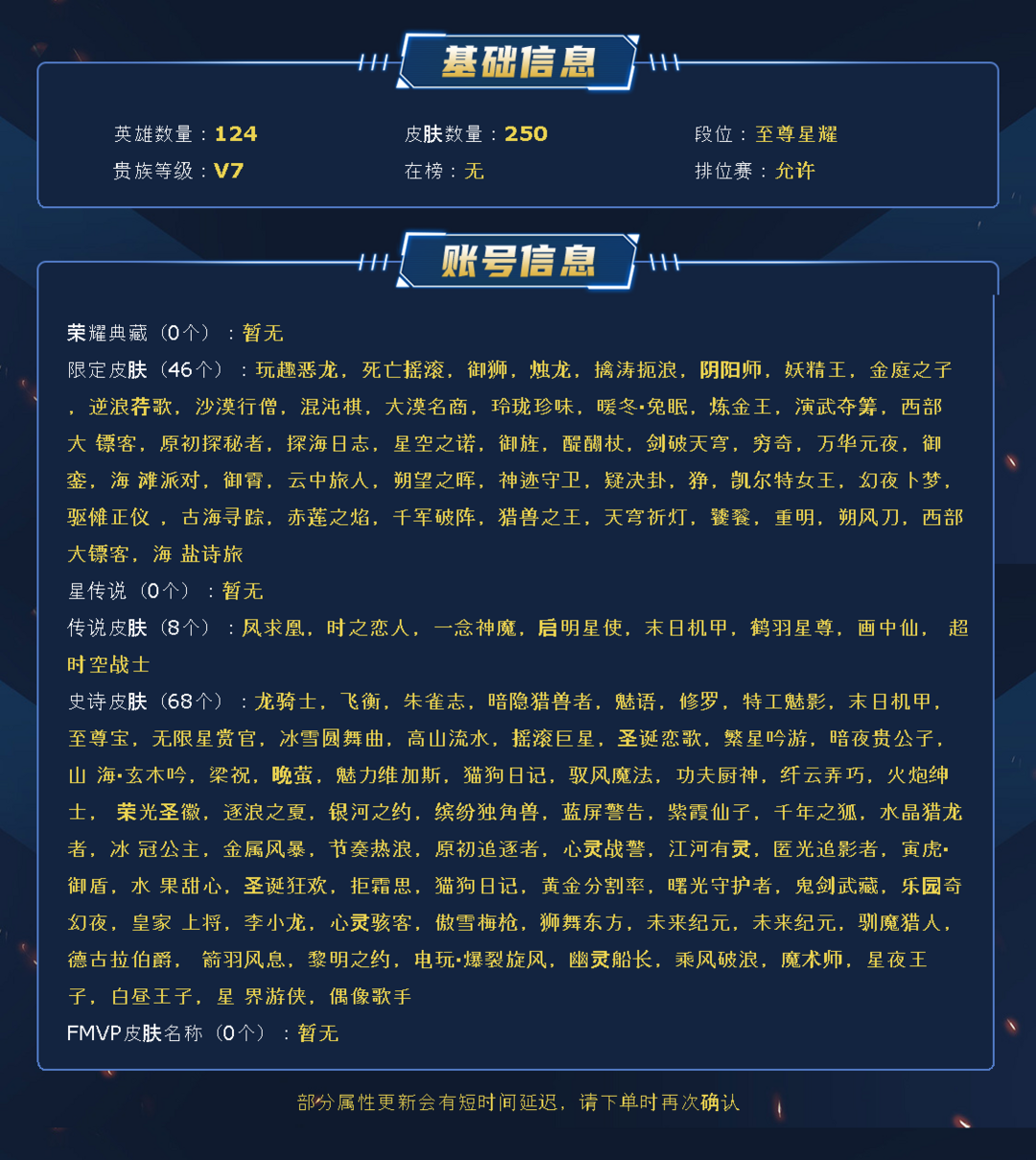 装备描述:贵族等级无,英雄数量119,典藏皮肤数0,皮肤数量241,街头霸王至尊宝凤求凰朱雀志飞衡梁祝匿光追影者傲雪梅枪