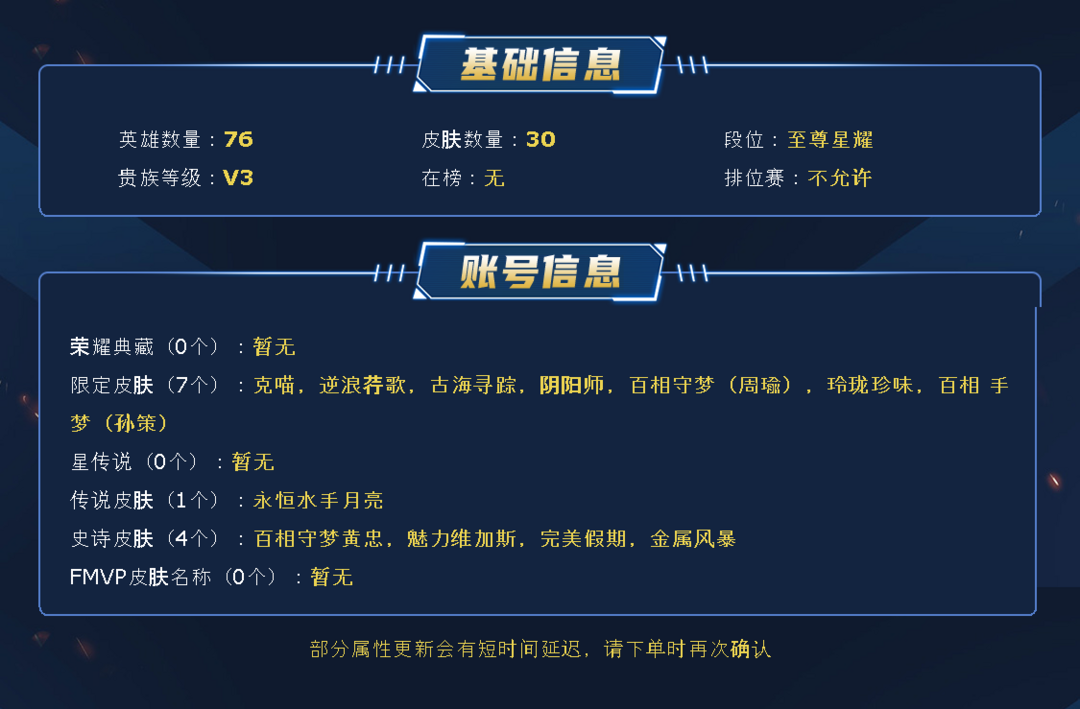 装备描述:贵族等级V3,英雄数量76,典藏皮肤数0,皮肤数量28,玩偶对对碰/精灵公主/忍●炎影/阴阳师