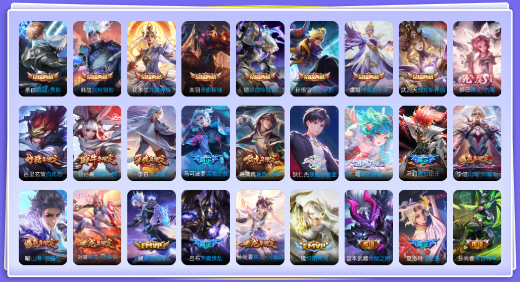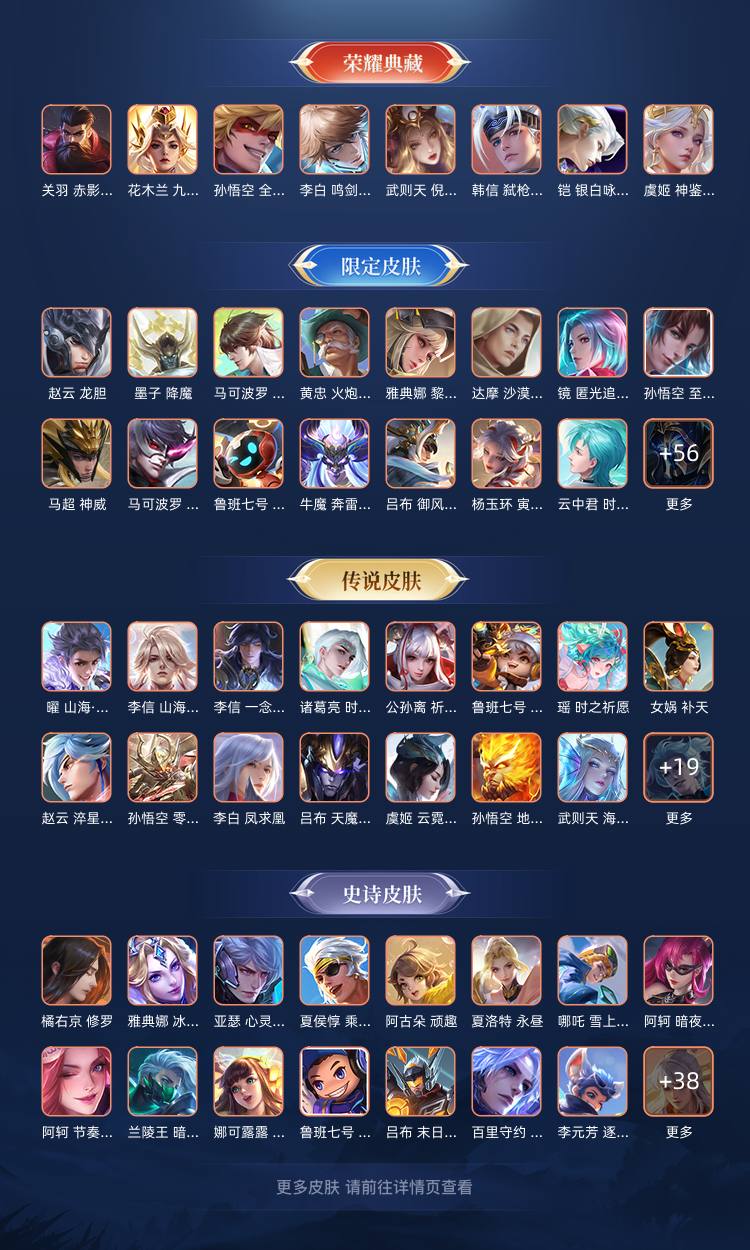 装备描述:【8 典藏皮肤】鸣剑·曳影 李白,全息碎影 孙悟空,倪克斯神谕 武则天,银白咏叹调 铠,神鉴启示录 虞姬,弑枪猎影 韩信,九霄神辉 花木兰,赤影疾锋 关羽, 【1 无双皮肤】青丘 ·九尾妲己, 【67 传说皮肤】枫霜尽 橘右京,胖达荣荣 梦奇,永恒水手月亮 王昭君,启明星使 虞姬,云霓雀翎 虞姬,前尘镜 娜可露露,碎云 百里守约,逐花归海 澜,时之祈愿 瑶,无双飞将 马超,白虎志 百里玄策,零号·赤焰 孙悟空,地狱火 孙悟空,云鹰飞将 曜,补天 女娲,夜礼服假面 狄仁杰,神器·狴犴令 狄仁杰,深海之息 马可波罗,觅芳踪 艾琳,凤求凰 李白,诗剑行 李白,灼幽烈阳 东皇太一,浮生妄 夏洛特,猫影幻舞 貂蝉,仲夏夜之梦 貂蝉,惊梅引 宫本武藏,记忆之芯 公孙离,地狱之眼 宫本武藏,祈雪灵祝 公孙离,默契交锋 兰陵王,海洋之心 武则天,时雨天司 诸葛亮,炽阳神光 镜,黄金射手座 后羿,遇见神鼓 吕布,曦玄引 吕布,霜月吟 露娜,寅虎·瑞焰 鲁班七号,乞巧织情 王昭君,乘龙·问璇玑 孙尚香,时之恋人 刘备,黄金狮子座 达摩,久胜战神 干将莫邪,末日机甲 孙尚香,乘龙·淬吴钩 孙策,异界灵契 孙